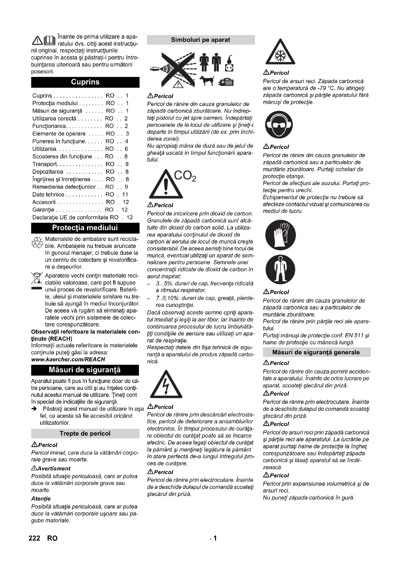 - %: dureri de cap, frecvenţa ridicată a ritmului respirator. – 7 ,10%: dureri de cap, greaţă, pierde- rea cunoştinţei. Dacă observaţi aceste semne opriţi apara- tul imediat şi ieşiţi la aer liber, iar înainte de continuarea procesului de lucru îmbunătă- ţiţi condiţiile de aerisire sau utilizaţi un apa- rat de respiraţie. Respectaţi datele din fişa tehnică de sigu- ranţă a aparatului de produs zăpadă carbo- nică. Pericol Pericol de rănire prin descărcări electrosta- tice, pericol de deteriorare a ansamblurilor electronice. În timpul procesului de curăţa- re obiectul de curăţat poate să se încarce electric. De aceea legaţi obiectul de curăţat la pământ şi menţineţi legătura la pământ în stare perfectă de-a lungul întregului pro- ces de curăţare. Pericol Pericol de rănire prin electrocutare. Înainte de a deschide dulapul de comandă scoateţi ştecărul din priză. Pericol Pericol de arsuri reci. Zăpada carbonică are o temperatură de -79 °C. Nu atingeţi zăpada carbonică şi părţile aparatului fără mănuşi de protecţie. Pericol Pericol de rănire din cauza granulelor de zăpadă carbonică sau a particulelor de murdărie zburătoare. Purtaţi ochelari de protecţie etanşe. Pericol de afecţiuni ale auzului. Purtaţi pro- tecţie pentru urechi. Echipamentul de protecţie nu trebuie să afecteze contactul vizual şi comunicarea cu mediul de lucru. Pericol Pericol de rănire din cauza granulelor de zăpadă carbonică sau a particulelor de murdărie zburătoare. Pericol de rănire prin părţile reci ale apara- tului. Purtaţi mănuşi de protecţie conf. EN 511 şi haine de protecţie cu mânecă lungă. Pericol Pericol de rănire din cauza pornirii acciden- tale a aparatului. Înainte de orice lucrare pe aparat, scoateţi ştecărul din priză. Pericol Pericol de rănire prin electrocutare. Înainte de a deschide dulapul de comandă scoateţi ştecărul din priză. Pericol Pericol de arsuri reci prin zăpadă carbonică şi părţile reci ale aparatului. La lucrările pe aparat purtaţi haine de protecţie la îngheţ corespunzătoare sau îndepărtaţi zăpada carbonică şi lăsaţi aparatul să se încăl- zească. Pericol Pericol prin expansiunea volumetrică şi de arsuri reci. Nu puneţi zăpada carbonică în gură. Cuprins Cuprins p. 0