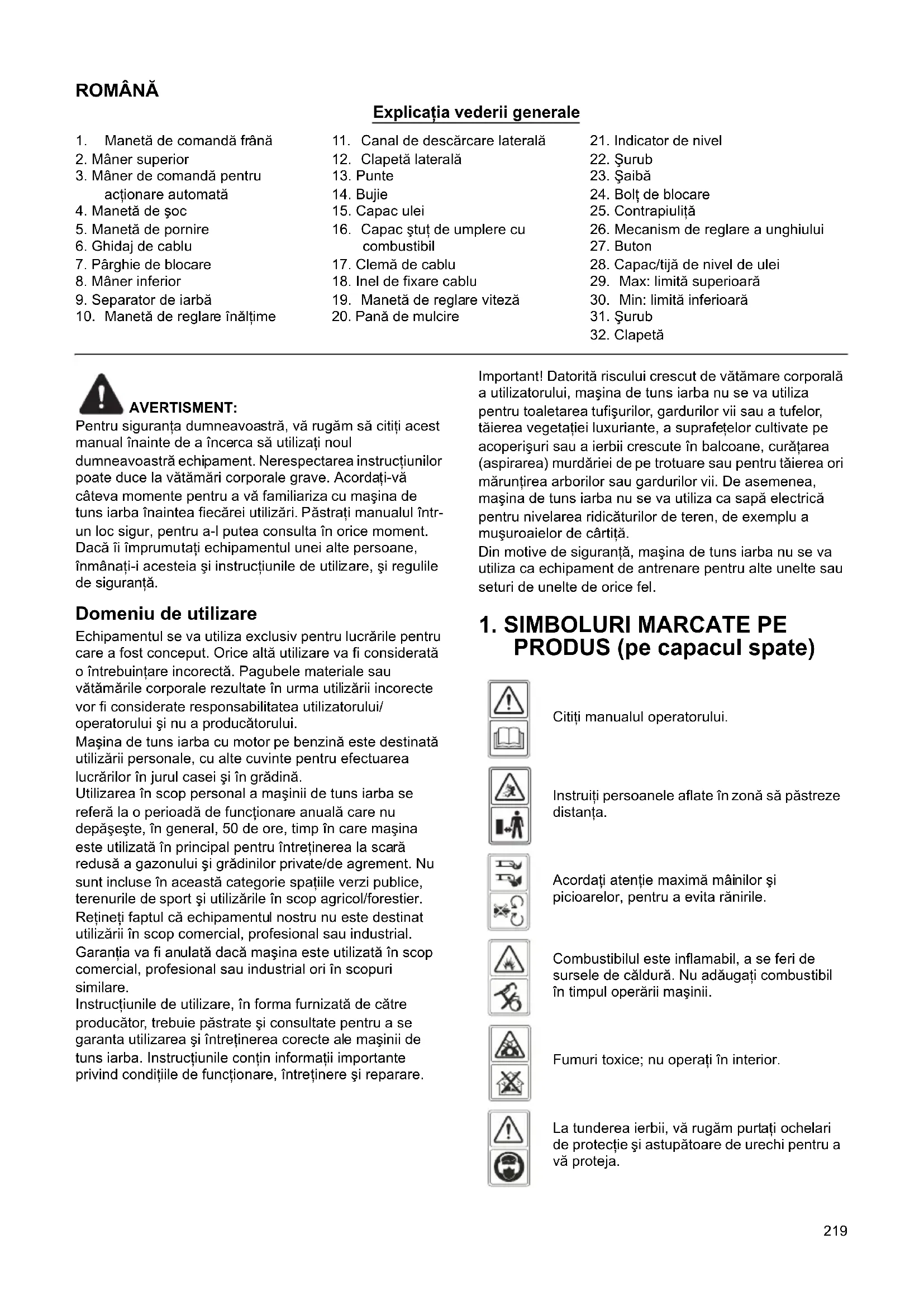 Pouze pro evropské země Prohlášení o shodě pro ES je k tomuto návodu k použití připojeno jako Příloha A.219 ROMÂNĂ Explicaţia vederii generale AVERTISMENT: Pentru siguranţa dumneavoastră, vă rugăm să citiţi acest manual înainte de a încerca să utilizaţi noul dumneavoastră echipament. Nerespectarea instrucţiunilor poate duce la vătămări corporale grave. Acordaţi-vă câteva momente pentru a vă familiariza cu maşina de tuns iarba înaintea fiecărei utilizări. Păstraţi manualul într- un loc sigur, pentru a-l putea consulta în orice moment. Dacă îi împrumutaţi echipamentul unei alte persoane, înmânaţi-i acesteia şi instrucţiunile de utilizare, şi regulile de siguranţă. Domeniu de utilizare Echipamentul se va utiliza exclusiv pentru lucrările pentru care a fost conceput. Orice altă utilizare va fi considerată o întrebuinţare incorectă. Pagubele materiale sau vătămările corporale rezultate în urma utilizării incorecte vor fi considerate responsabilitatea utilizatorului/ operatorului şi nu a producătorului. Maşina de tuns iarba cu motor pe benzină este destinată utilizării personale, cu alte cuvinte pentru efectuarea lucrărilor în jurul casei şi în grădină. Utilizarea în scop personal a maşinii de tuns iarba se referă la o perioadă de funcţionare anuală care nu depăşeşte, în general, 50 de ore, timp în care maşina este utilizată în principal pentru întreţinerea la scară redusă a gazonului şi grădinilor private/de agrement. Nu sunt incluse în această categorie spaţiile verzi publice, terenurile de sport şi utilizările în scop agricol/forestier. Reţineţi faptul că echipamentul nostru nu este destinat utilizării în scop comercial, profesional sau industrial. Garanţ ia va fi anulată dacă maşina est e utilizată în scop comercial, profesional sau industrial ori în scopuri similare. Instrucţiunile de utilizare, în forma furnizată de către producător, trebuie păstrate şi consultate pentru a se garanta utilizarea şi întreţinerea corecte ale maşinii de tuns iarba. Instrucţiunile conţin informaţii importante privind condiţiile de funcţionare, întreţinere şi reparare. Important! Datorită riscului crescut de vătămare corporală a utilizatorului, maşina de tuns iarba nu se va utiliza pentru toaletarea tufişurilor, gardurilor vii sau a tufelor, tăierea vegetaţiei luxuriante, a suprafeţelor cultivate pe acoperişuri sau a ierbii crescute în balcoane, curăţarea (aspirarea) murdăriei de pe trotuare sau pentru tăierea ori mărunţirea arborilor sau gardurilor vii. De asemenea, maşina de tuns iarba nu se va utiliza ca sapă electrică pentru nivelarea ridicăturilor de teren, de exemplu a muşuroaielor de cârtiţă. Din motive de siguranţă, maşina de tuns iarba nu se va utiliza ca echipament de antrenare pentru alte unelte sau seturi de unelte de orice fel.