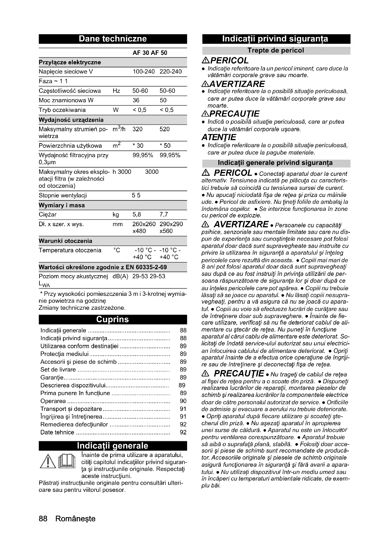 pentru ventilarea corespunzătoare. ● Aparatul trebuie să aibă o suprafaţă plană, stabilă. ● Folosiţi doar acce- sorii şi piese de schimb sunt recomandate de producă- tor. Accesoriile originale şi piesele de schimb originale asigură funcţionarea în siguranţă şi fără avarii a apara- tului. ● Nu utilizați dispozitivul într-un mediu umed sau în încăperi cu temperaturi ambientale ridicate, de exem- plu băi. AF 30 AF 50 Przyłącze elektryczne Napięcie sieciowe V 100-240 220-240 Faza ~ 1 1 Częstotliwość sieciowa Hz 50-60 50-60 Moc znamionowa W