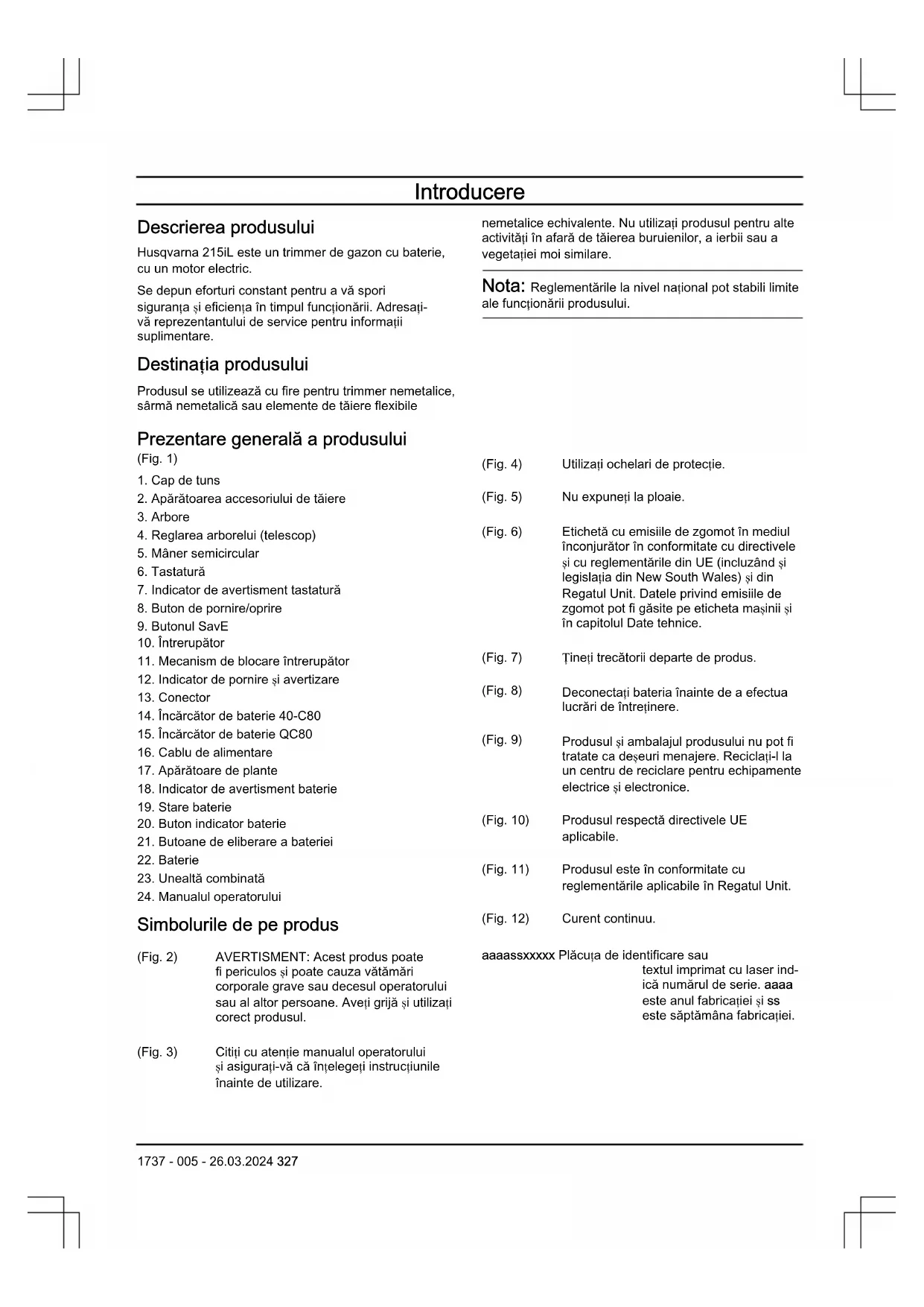 - Anexă 326 1737 - 005 - 26.03.2024Introducere Descrierea produsului Husqvarna 215iL este un trimmer de gazon cu baterie, cu un motor electric. Se depun eforturi constant pentru a vă spori siguranța și eficiența în timpul funcționării. Adresați- vă reprezentantului de service pentru informații suplimentare. Destinația produsului Produsul se utilizează cu fire pentru trimmer nemetalice, sârmă nemetalică sau elemente de tăiere flexibile nemetalice echivalente. Nu utilizați produsul pentru alte activități în afară de tăierea buruienilor, a ierbii sau a vegetației moi similare. Nota: Reglementările la nivel național pot stabili limite ale funcționării produsului. Prezentare generală a produsului (Fig. 1) p. 454