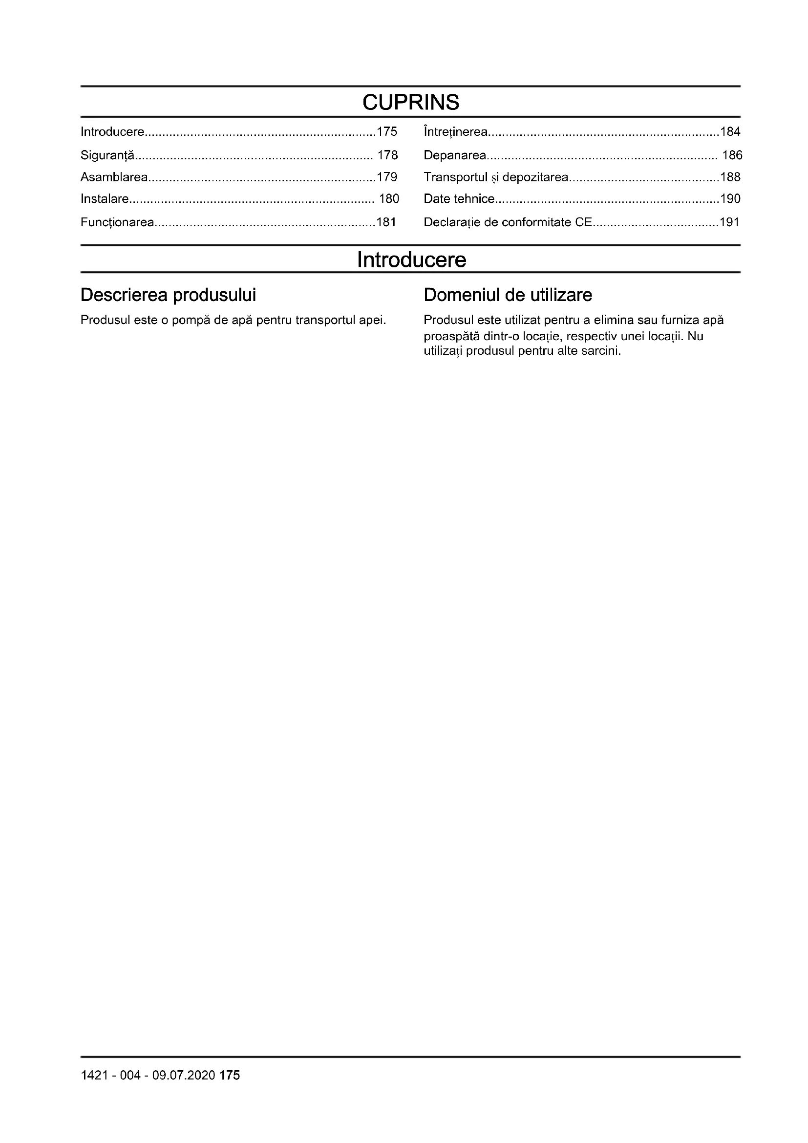- Declarație de conformitate CE Introducere Descrierea produsului Produsul este o pompă de apă pentru transportul apei. Domeniul de utilizare Produsul este utilizat pentru a elimina sau furniza apă proaspătă dintr-o locație, respectiv unei locații. Nu utilizați produsul pentru alte sarcini. 1421 - 004 - 09.07.2020 175Prezentarea generală a produsului p. 191