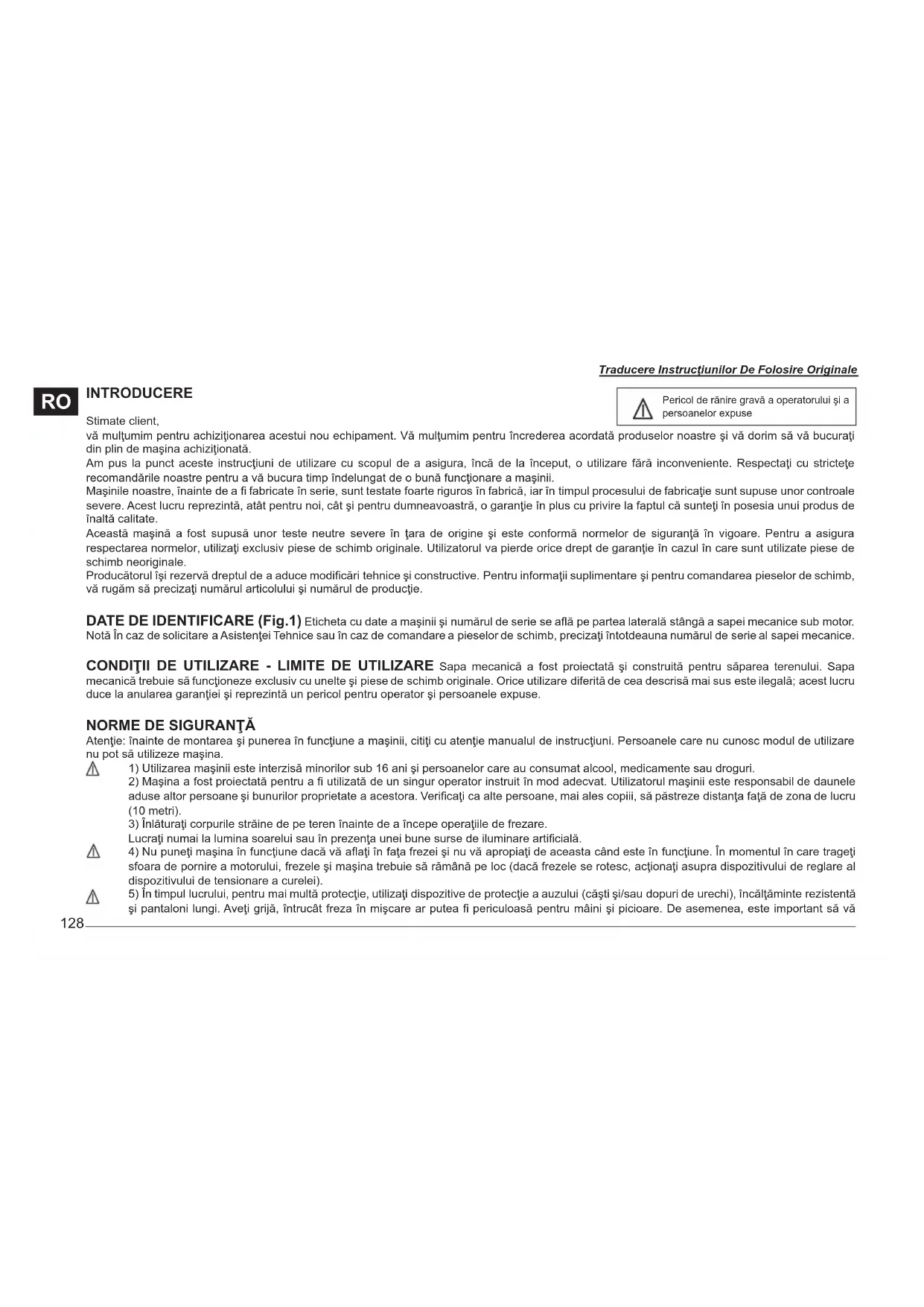 Pericol de rănire gravă a operatorului şi a persoanelor expuse Traducere Instrucţiunilor De Folosire Originale129