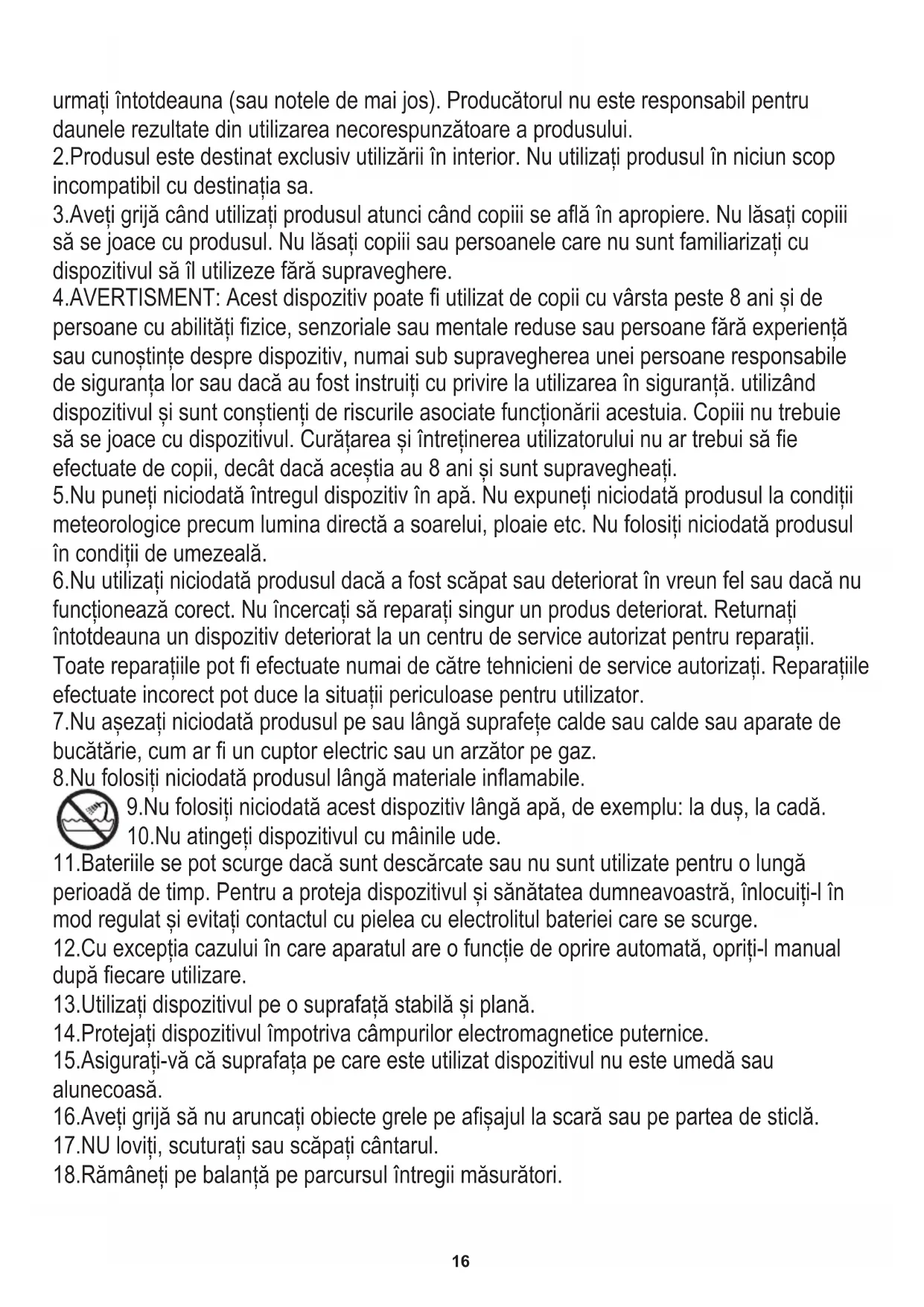 Aizveriet akumulatora nodalījuma vāku. SOLIS 1. Novietojiet svaru uz cietas un līdzenas virsmas (izvairieties no paklājiem un mīkstām virsmām). Apkārtējās vides aizsardzība. Kartona iepakojumu, lūdzu, nododiet otreizējai pārstrādei. Polietilēna maisiņus (PE) izmest plastmasas izstrādājumiem paredzētajos konteineros. Lietotās elektropreces nododiet attiecīgajos pieņemšanas punktos. Ierīcē satur bīstamas sastāvdaļas, kas var izraisīt draudus apkārtējai videi. Elektroierīce jānodod tā, lai ierobežotu tās atkārtotu izmantošanu. Ja ierīcē atrodas baterijas, izņemiet tās un nododiet pieņemšanas punktā atsevišķi. Produktu neizmest sadzīves atkritumu konteinerā ROMÂNĂ Dispozitivul este destinat numai pentru uz casnic. CONDIȚII DE SIGURANȚĂ. INSTRUCȚIUNI IMPORTANTE DE SIGURANȚĂ CITIȚI CU ATENȚIE ȘI PĂSTRAȚI PENTRU REFERINȚE VIITOARE 1.Înainte de a utiliza produsul, vă rugăm să citiți cu atenție următoarele instrucțiuni și să le16 10.Nu atingeți dispozitivul cu mâinile ude. 12.Cu excepția cazului în care aparatul are o funcție de oprire automată, opriți-l manual după fiecare utilizare. 2.Produsul este destinat exclusiv utilizării în interior. Nu utilizați produsul în niciun scop incompatibil cu destinația sa. 6.Nu utilizați niciodată produsul dacă a fost scăpat sau deteriorat în vreun fel sau dacă nu funcționează corect. Nu încercați să reparați singur un produs deteriorat. Returnați întotdeauna un dispozitiv deteriorat la un centru de service autorizat pentru reparații. Toate reparațiile pot fi efectuate numai de către tehnicieni de service autorizați. Reparațiile efectuate incorect pot duce la situații periculoase pentru utilizator. 4.AVERTISMENT: Acest dispozitiv poate fi utilizat de copii cu vârsta peste 8 ani și de persoane cu abilități fizice, senzoriale sau mentale reduse sau persoane fără experiență sau cunoștințe despre dispozitiv, numai sub supravegherea unei persoane responsabile de siguranța lor sau dacă au fost instruiți cu privire la utilizarea în siguranță. utilizând dispozitivul și sunt conștienți de riscurile asociate funcționării acestuia. Copiii nu trebuie să se joace cu dispozitivul. Curățarea și întreținerea utilizatorului nu ar trebui să fie efectuate de copii, decât dacă aceștia au 8 ani și sunt supravegheați. 9.Nu folosiți niciodată acest dispozitiv lângă apă, de exemplu: la duș, la cadă. 7.Nu așezați niciodată produsul pe sau lângă suprafețe calde sau calde sau aparate de bucătărie, cum ar fi un cuptor electric sau un arzător pe gaz. 11.Bateriile se pot scurge dacă sunt descărcate sau nu sunt utilizate pentru o lungă perioadă de timp. Pentru a proteja dispozitivul și sănătatea dumneavoastră, înlocuiți-l în mod regulat și evitați contactul cu pielea cu electrolitul bateriei care se scurge. 13.Utilizați dispozitivul pe o suprafață stabilă și plană. 3.Aveți grijă când utilizați produsul atunci când copiii se află în apropiere. Nu lăsați copiii să se joace cu produsul. Nu lăsați copiii sau persoanele care nu sunt familiarizați cu dispozitivul să îl utilizeze fără supraveghere. 14.Protejați dispozitivul împotriva câmpurilor electromagnetice puternice. 15.Asigurați-vă că suprafața pe care este utilizat dispozitivul nu este umedă sau alunecoasă. 16.Aveți grijă să nu aruncați obiecte grele pe afișajul la scară sau pe partea de sticlă. urmați întotdeauna (sau notele de mai jos). Producătorul nu este responsabil pentru daunele rezultate din utilizarea necorespunzătoare a produsului. 5.Nu puneți niciodată întregul dispozitiv în apă. Nu expuneți niciodată produsul la condiții meteorologice precum lumina directă a soarelui, ploaie etc. Nu folosiți niciodată produsul în condiții de umezeală. 8.Nu folosiți niciodată produsul lângă materiale inflamabile. 17.NU loviți, scuturați sau scăpați cântarul. 18.Rămâneți pe balanță pe parcursul întregii măsurători.17 PASUL 2. Apăsați cântarul, dispozitivul se va porni automat. Așteptați până când pe afișaj apare „0,0”. ÎNLOCUIREA BATERIEI Selectarea unităților de măsură OPERAȚIUNE Deschideți compartimentul bateriei. Puneți bateria în poziția corectă. Închideți capacul compartimentului pentru baterii. Închideți capacul compartimentului pentru baterii. PASUL 3. Pași încet pe scară. Rămâneți uniform pe cântar și nu vă mișcați până când indicația de greutate de pe afișaj nu se va modifica și va fi blocată. OPRIRE AUTOMATĂ Când renunțați la cântar, dispozitivul se va opri automat. Cântarul se oprește automat după 12 secunde.