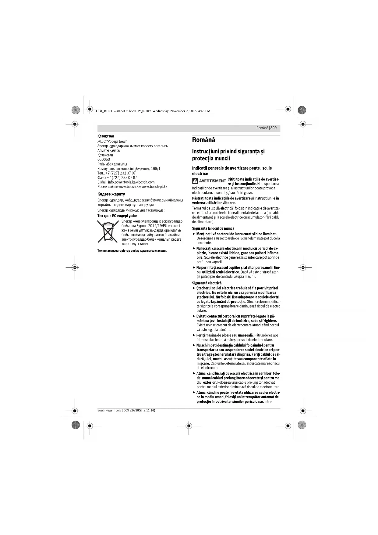 Райымбек данғылы Коммунальная көшесінің бұрышы, 169/1 Тел.: +7 (727) 232 37 07 Факс: +7 (727) 233 07 87 E-Mail: info.powertools.ka@bosch.com Ресми сайты: www.bosch.kz; www.bosch-pt.kz Кәдеге жарату Электр құралдар, жабдықтар және бумаларын айналаны қорғайтын кәдеге жаратуға апару қажет. Электр құрлдарды үй қоқысына тастамаңыз! Тек қана ЕО елдері үшін: Электр және электрондық ескі құралдар бойынша Еуропа 2012/19/EU ережесі және оның ұлттық заңдарда орындалуы бойынша басқа пайдаланып болмайтын электр құралдар бөлек жиналып кәдеге жаратылуы қажет. Техникалық өзгерістер енгізу құқығы сақталады. Română Instrucţiuni privind siguranţa şi protecţia muncii Indicaţii generale de avertizare pentru scule electrice Citiţi toate indicaţiile de avertiza- re şi instrucţiunile. Nerespectarea indicaţiilor de avertizare şi a instrucţiunilor poate provoca electrocutare, incendii şi/sau răniri grave. Păstraţi toate indicaţiile de avertizare şi instrucţiunile în vederea utilizărilor viitoare. Termenul de „sculă electrică“ folosit în indicaţiile de avertiza- re se referă la sculele electrice alimentate de la reţea (cu cablu de alimentare) şi la sculele electrice cu acumulator (fără cablu de alimentare). Siguranţa la locul de muncă Menţineţi-vă sectorul de lucru curat şi bine iluminat. Dezordinea sau sectoarele de lucru neluminate pot duce la accidente. Nu lucraţi cu scula electrică în mediu cu pericol de ex- plozie, în care există lichide, gaze sau pulberi inflama- bile. Sculele electrice generează scântei care pot aprinde praful sau vaporii. Nu permiteţi accesul copiilor şi al altor persoane în tim- pul utilizării sculei electrice. Dacă vă este distrasă aten- ţia puteţi pierde controlul asupra maşinii. Siguranţă electrică Ştecherul sculei electrice trebuie să fie potrivit prizei electrice. Nu este în nici un caz permisă modificarea ştecherului. Nu folosiţi fişe adaptoare la sculele electri- ce legate la pământ de protecţie. Ştecherele nemodifica- te şi prizele corespunzătoare diminuează riscul de electro- cutare. Evitaţi contactul corporal cu suprafeţe legate la pă- mânt ca ţevi, instala ţii de încălzire, sobe şi frigidere. Există un risc crescut de electrocutare atunci când corpul vă este legat la pământ. Feriţi maşina de ploaie sau umezeală. Pătrunderea apei într-o sculă electrică măreşte riscul de electrocutare. Nu schimbaţi destinaţia cablului folosindu-l pentru transportarea sau suspendarea sculei electrice ori pen- tru a trage ştecherul afară din priză. Feriţi cablul de căl- dură, ulei, muchii ascuţite sau componente aflate în mişcare. Cablurile deteriorate sau încurcate măresc riscul de electrocutare. Atunci când lucraţi cu o sculă electrică în aer liber, folo- siţi numai cabluri prelungitoare adecvate şi pentru me- diul exterior. Folosirea unui cablu prelungitor adecvat pentru mediul exterior diminuează riscul de electrocutare. Atunci când nu poate fi evitată utilizarea sculei electri- ce în mediu umed, folosiţi un întrerupător automat de protecţie împotriva tensiunilor periculoase. Între- AVERTISMENT OBJ_BUCH-2487-002.book Page 309 Wednesday, November 2, 2016 4:43 PM310 | Română 1 609 92A 36G | (2.11.16) Bosch Power Tools buinţarea unui întrerupător automat de protecţie împotri- va tensiunilor periculoase reduce riscul de electrocutare. Siguranţa persoanelor Fiţi atenţi, aveţi grijă de ceea ce faceţi şi procedaţi raţi- onal atunci când lucraţi cu o sculă electrică. Nu folosiţi scula electrică atunci când sunteţi obosiţi sau vă aflaţi sub influenţa drogurilor, a alcoolului sau a medicamen- telor. Un moment de neatenţie în timpul utilizării maşinii poate duce la răniri grave. Purtaţi echipament personal de protecţie şi întotdeau- na ochelari de protecţie. Purtarea echipamentului perso- nal de protecţie, ca masca pentru praf, încălţăminte de si- guranţă antiderapantă, casca de protecţie sau protecţia auditivă, în funcţie de tipul şi utilizarea sculei electrice, diminuează riscul rănirilor. Evitaţi o punere în funcţiune involuntară. Înainte de a introduce ştecherul în priză şi/sau de a introduce acu- mulatorul în scula electrică, de a o ridica sau de a o transporta, asiguraţi-vă că aceasta este oprită. Dacă atunci când transportaţi scula electrică ţineţi degetul pe întrerupător sau dacă porniţi scula electrică înainte de a o racorda la reţeaua de curent, puteţi provoca accidente. Înainte de pornirea sculei electrice îndepărtaţi dispozi- tivele de reglare sau cheile fixe din aceasta. Un dispozi- tiv sau o cheie lăsată într-o componentă de maşină care se roteşte poate duce la răniri. Evitaţi o ţinută corporală nefirească. Adoptaţi o poziţie stabilă şi menţineţi-vă întotdeauna echilibrul. Astfel veţi putea controla mai bine maşina în situaţii neaşteptate. Purtaţi îmbrăcăminte adecvată. Nu purtaţi îmbrăcă- minte largă sau podoabe. Feriţi părul, îmbrăcămintea şi mănuşile de piesele aflate în mişcare. Îmbrăcămintea largă, părul lung sau podoabele pot fi prinse în piesele afla- te în mişcare. Dacă pot fi montate echipamente de aspirare şi colec- tare a prafului, asiguraţi-vă că acestea sunt racordate şi folosite în mod corect. Folosirea unei instalaţii de aspi- rare a prafului poate duce la reducerea poluării cu praf. Utilizarea şi manevrarea atentă a sculelor electrice Nu suprasolicitaţi maşina. Folosiţi pentru executarea lucrării dv.