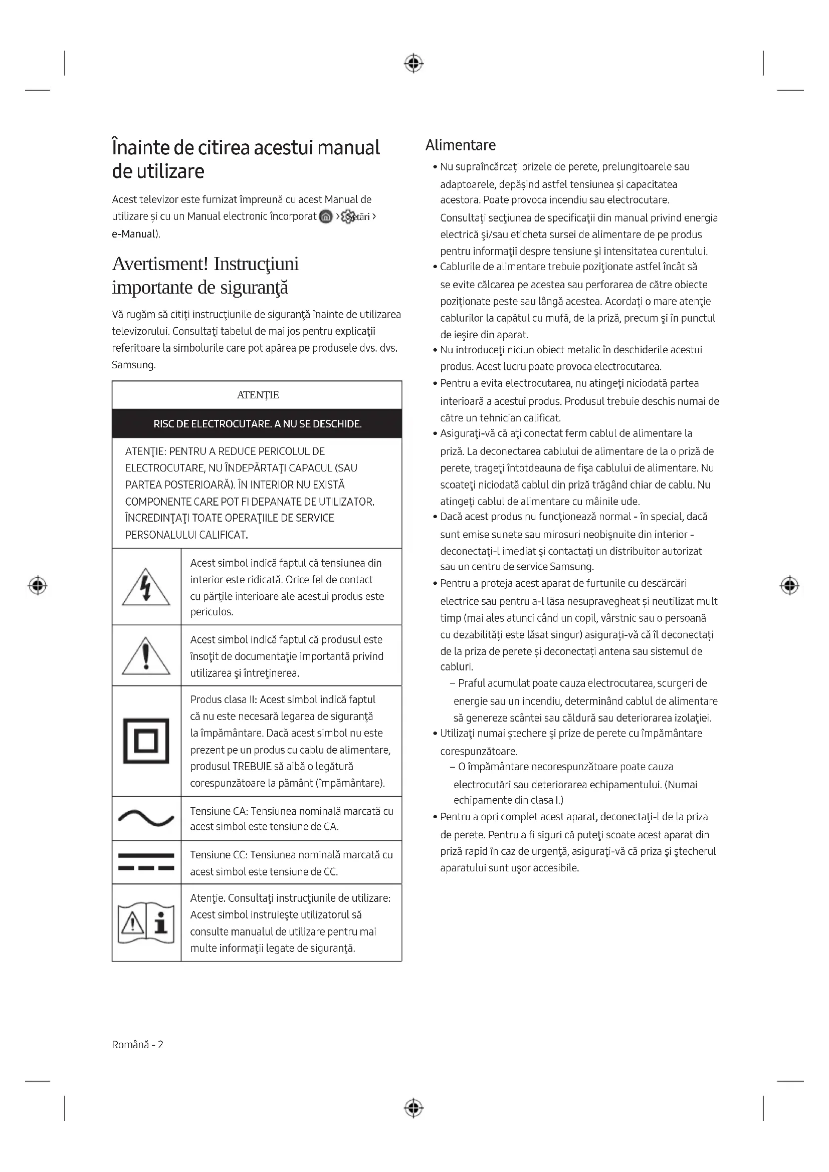 - Imaginile şi ilustraţiile din acest manual de utilizare sunt furnizate doar în scop orientativ şi pot diferi de aspectul real al produsului. Designul şi specificaţiile produsului se pot schimba fără notificare prealabilă. Vă rugăm să aveți în vedere faptul că în urma reparației efectuate de către un furnizor de servicii neautorizat, reparației efectuate de dumneavoastră sau a oricărei intervenții non-profesionale asupra produsului, Samsung nu este responsabilă pentru nicio deteriorare a aparatului, orice vătămare sau orice altă problemă de siguranță a acestuia cauzată de orice încercare de reparare a dispozitivului care nu respectă cu atenție aceste instrucțiuni de reparație și întreținere. Orice deteriorare a produsului cauzată de încercarea de a repara produsul de către orice altă persoană decât un furnizor de servicii certificat Samsung, nu va fi acoperită de garanție. Translation - Vă rugăm să vizitați samsung.com/ro/support pentru a afla mai multe informații despre adaptorul de alimentare extern și controlul la distanță asociate cu directiva UE Ecodesign - Reglementare ErP Română - 8Casarea corectă a acestui produs (deşeuri de echipamente electrice & electronice) (Aplicabil în ţările cu sisteme de colectare separată) Acest marcaj aplicat pe produs sau accesorii sau inclus în documentaţie indică faptul că produsul şi accesoriile sale electronice (de exemplu, încărcătorul, căştile, cablul USB) nu trebuie casate împreună cu alte deşeuri menajere la sfârşitul duratei de viaţă. Pentru a împiedica afectarea mediului înconjurător sau a sănătăţii umane din cauza eliminării necontrolate a deşeurilor, vă rugăm să separaţi aceste articole de alte tipuri de deşeuri şi să le reciclaţi în mod responsabil pentru a promova reutilizarea durabilă a resurselor materiale. Utilizatorii casnici trebuie să contacteze comerciantul de la care au achiziţionat acest produs sau autoritatea guvernamentală locală pentru a afla detalii despre locul şi modalitatea în care aceste articole pot fi reciclate ecologic în condiţii de siguranţă. Utilizatorii industriali trebuie să contacteze furnizorul şi să consulte termenii şi condiţiile contractului de achiziţie. Acest produs şi accesoriile sale electronice nu trebuie amestecate cu alte deşeuri comerciale pentru casare. Eliminarea corectă a bateriilor din acest produs (Aplicabil în ţările cu sisteme de colectare separată) Acest marcaj aplicat pe baterie, pe manual sau pe ambalaj indică faptul că bateriile din acest produs nu trebuie eliminate împreună cu alte deşeuri menajere la sfârşitul duratei de utilizare. Dacă sunt marcate, simbolurile chimice Hg, Cd sau Pb indică faptul că bateriile conţin mercur, cadmiu sau plumb peste nivelurile de referinţă stipulate prin Directiva CE 2006/66. Dacă bateriile nu sunt casate adecvat, aceste substanţe pot afecta sănătatea umană sau pot provoca daune mediului înconjurător. Pentru a proteja resursele naturale şi a promova reutilizarea materialelor, vă rugăm să separaţi bateriile de alte tipuri de deşeuri şi să le reciclaţi prin intermediul sistemului local gratuit de colectare a bateriilor. Română - 9 RomânăPre čitanja ovog korisničkog priručnika Televizor se isporučuje sa ovim korisničkim priručnikom i ugrađenim e-priručnikom ( > Podešavanja > e-Manual). Upozorenje! Važna bezbednosna uputstva Pre korišćenja televizora pročitajte bezbednosna uputstva. Objašnjenja simbola koji se mogu naći na proizvodu kompanije Samsung potražite u sledećoj tabeli. OPREZ RIZIK OD STRUJNOG UDARA. NE OTVARAJTE. OPREZ: DA BISTE SMANJILI RIZIK OD STRUJNOG UDARA, NEMOJTE SKIDATI POKLOPAC (NITI POLEĐINU). U UNUTRAŠNJOSTI UREĐAJA NEMA DELOVA KOJE SAMI MOŽETE DA SERVISIRATE. SVE VRSTE SERVISIRANJA PREPUSTITE KVALIFIKOVANIM SERVISERIMA. Ovaj simbol ukazuje na to da je unutar uređaja prisutan visoki napon. Svaka vrsta kontakta sa unutrašnjim komponentama ovog uređaja predstavlja opasnost. Ovaj simbol ukazuje na to da se uz proizvod isporučuje važna dokumentacija koja se odnosi na rukovanje i održavanje. Proizvod klase II: Ovaj simbol označava da povezivanje na zaštitno električno uzemljenje nije neophodno. Ako na kablu za napajanje proizvoda nema simbola, proizvod MORA biti sigurno povezan sa uzemljenjem. Naizmenična struja: Nominalni napon označen ovim simbolom je napon naizmenične struje. Jednosmerna struja: Nominalni napon označen ovim simbolom je napon jednosmerne struje. Oprez. Pogledajte uputstva za upotrebu: Ovaj simbol upućuje korisnika da u korisničkom priručniku pročita dodatne informacije u vezi sa bezbednošću. Napajanje