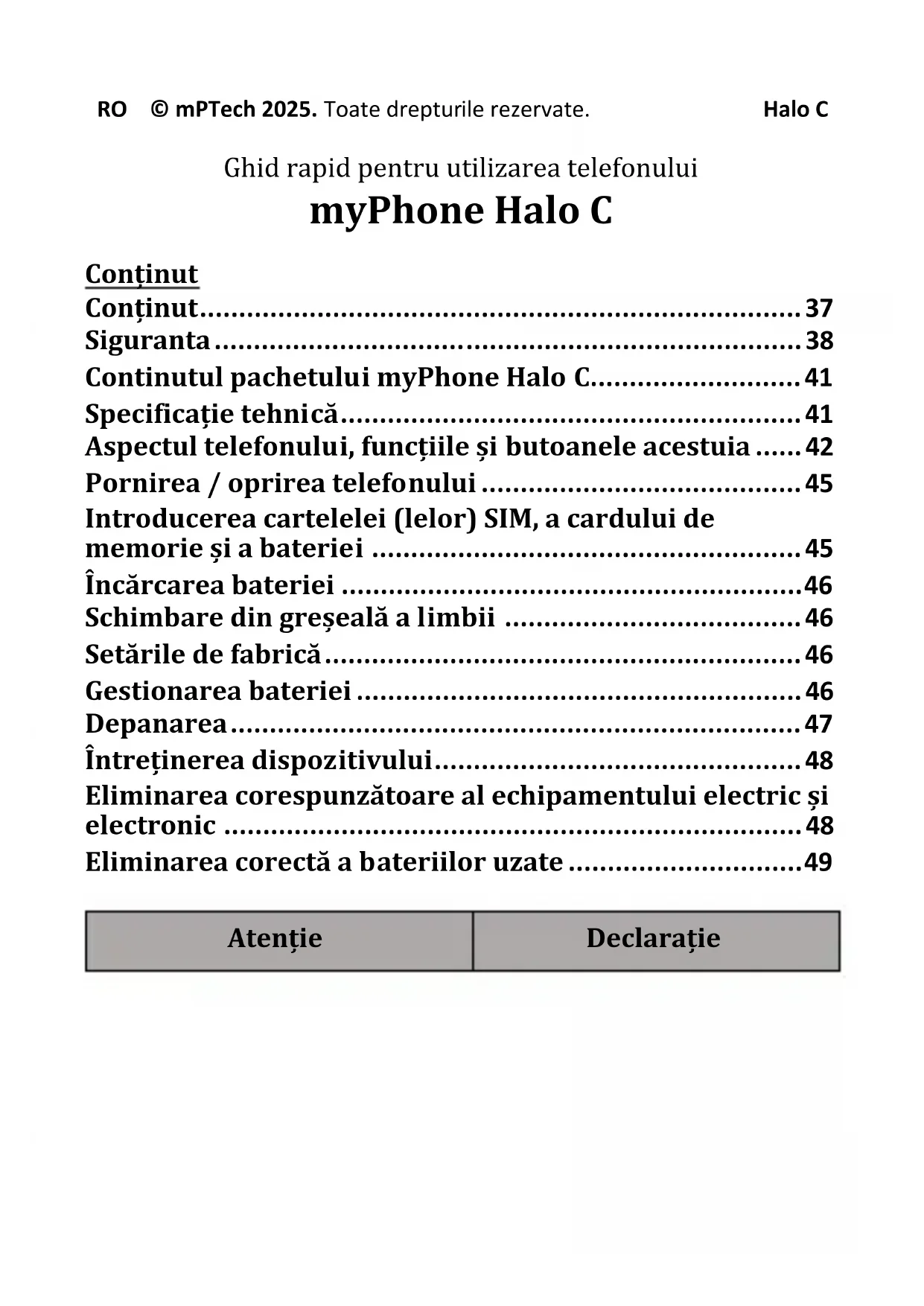 - Eliminarea corectă a bateriilor uzate Atenție DeclarațieRO © mPTech 2025. Toate drepturile rezervate. Halo C p. 49