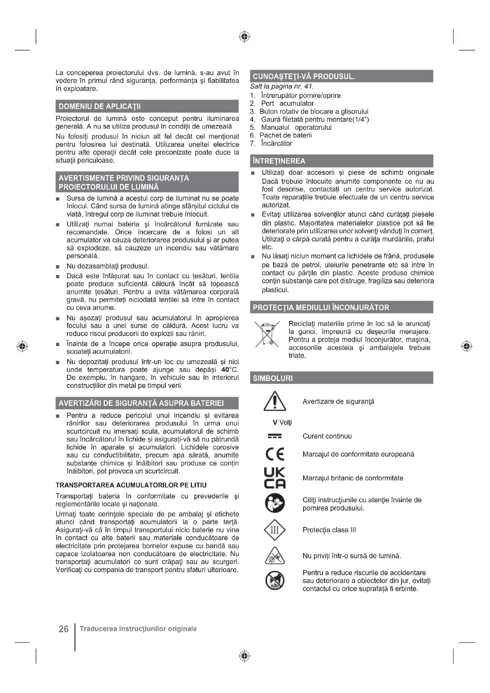 ■ Sursa de lumină a acestui corp de iluminat nu se poate înlocui. Când sursa de lumină atinge sfârșitul ciclului de viață, întregul corp de iluminat trebuie înlocuit. ■ Utilizaţi numai bateria şi încărcătorul furnizate sau recomandate. Orice încercare de a folosi un alt acumulator va cauza deteriorarea produsului şi ar putea să explodeze, să cauzeze un incendiu sau vătămare personală. ■ Nu dezasamblaţi produsul. ■ Dacă este înfășurat sau în contact cu țesături, lentila poate produce suficientă căldură încât să topească anumite țesături. Pentru a evita vătămarea corporală gravă, nu permiteți niciodată lentilei să intre în contact cu ceva anume. ■ Nu așezați produsul sau acumulatorul în apropierea focului sau a unei surse de căldură. Acest lucru va reduce riscul producerii de explozii sau răniri. ■ Înainte de a începe orice operație asupra produsului, scoateți acumulatorii. ■ Nu depozitați produsul într-un loc cu umezeală și nici unde temperatura poate ajunge sau depăși 40°C. De exemplu, în hangare, în vehicule sau în interiorul construcțiilor din metal pe timpul verii.