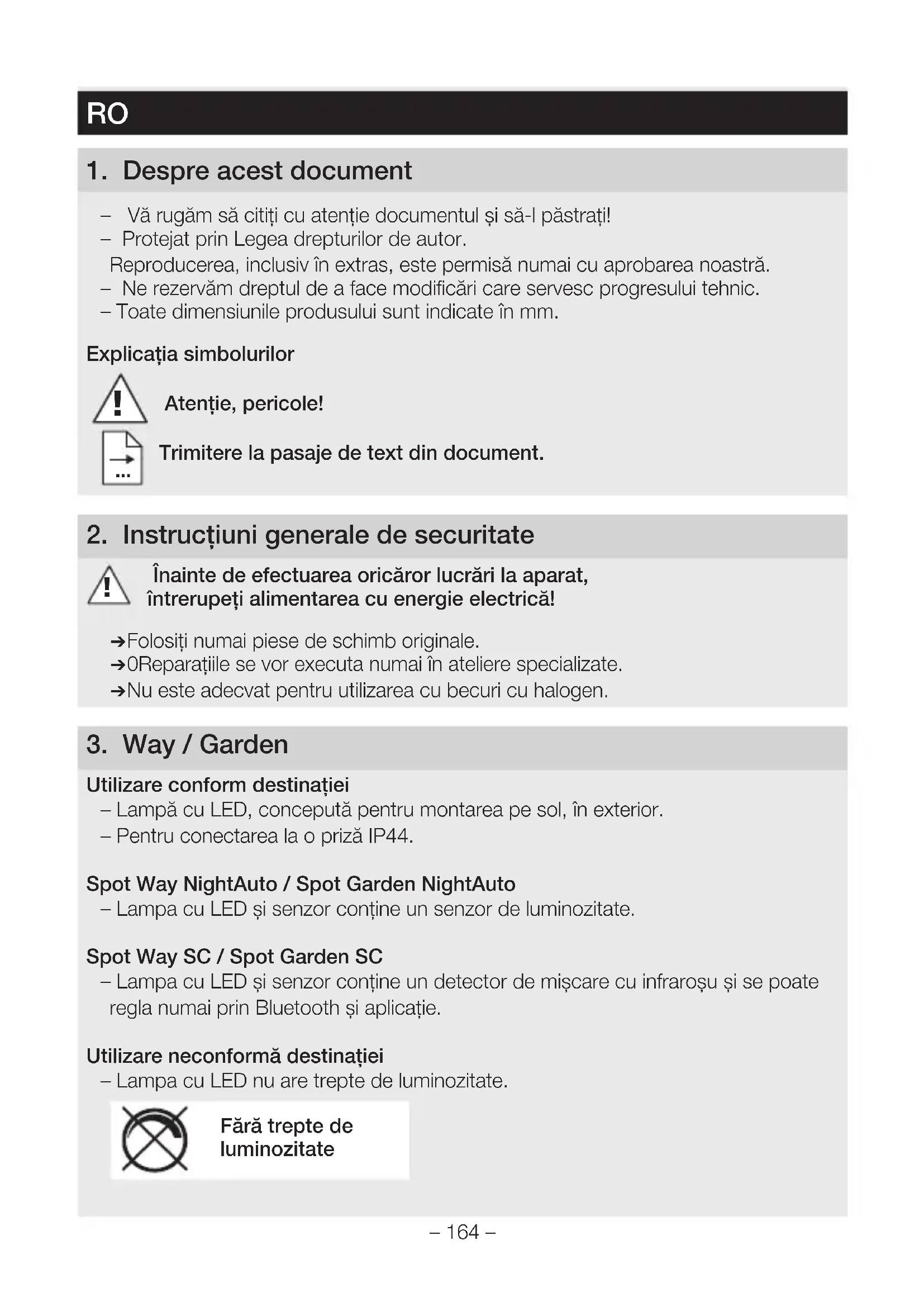 Utilizare conform destinaţiei – Lampă cu LED, concepută pentru montarea pe sol, în exterior. – Pentru conectarea la o priză IP44. Spot Way NightAuto/Spot Garden NightAuto – Lampa cu LED şi senzor conţine un senzor de luminozitate. Spot Way SC/Spot Garden SC – Lampa cu LED şi senzor conţine un detector de mişcare cu infraroşu şi se poate regla numai prin Bluetooth şi aplicaţie. Utilizare neconformă destinaţiei – Lampa cu LED nu are trepte de luminozitate. Fără trepte de luminozitate– 165 – Volumul livrării Spot Way (Fig. 3.1) – Lampă, incl. stâlp, placă de montat pe sol şi cablu de racord cu ştecher de alimentare – Trei şuruburi – Trei dibluri Volumul livrării (Fig. 3.2) – Lampă, incl. cablu de racord cu ştecher de alimentare – Lance – Două şuruburi Dimensiuni produs Spot Way (Fig. 3.3) Dimensiuni produs Spot Garden (Fig. 3.4) Prezentare sintetică a produsului (Fig. 3.5 – 3.10) A Carcasă lampă B Senzor de mişcare (numai Spot Way/Garden SC) C Senzor de luminozitate (numai Spot Way/Garden NightAuto) D Setarea luminozităţii de comutare (numai Spot Way/Garden NightAuto) E Stâlp cu placă de montat pe sol (numai Spot Way) F Lance (numai Spot Garden) G Cablu de racord cu ştecher Domeniu de detecţie Spot Way/Garden SC (Fig. 3.11-3.16) Distribuirea intensităţii luminii (Fig. 3.17)