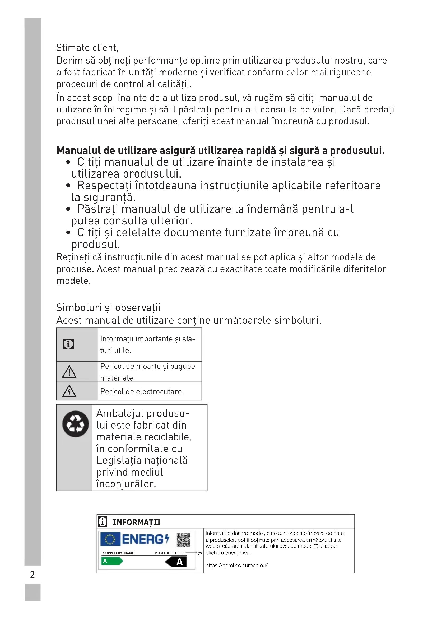 - Citiţimanualuldeutilizareînaintedeinstalareaşi utilizareaprodusului.