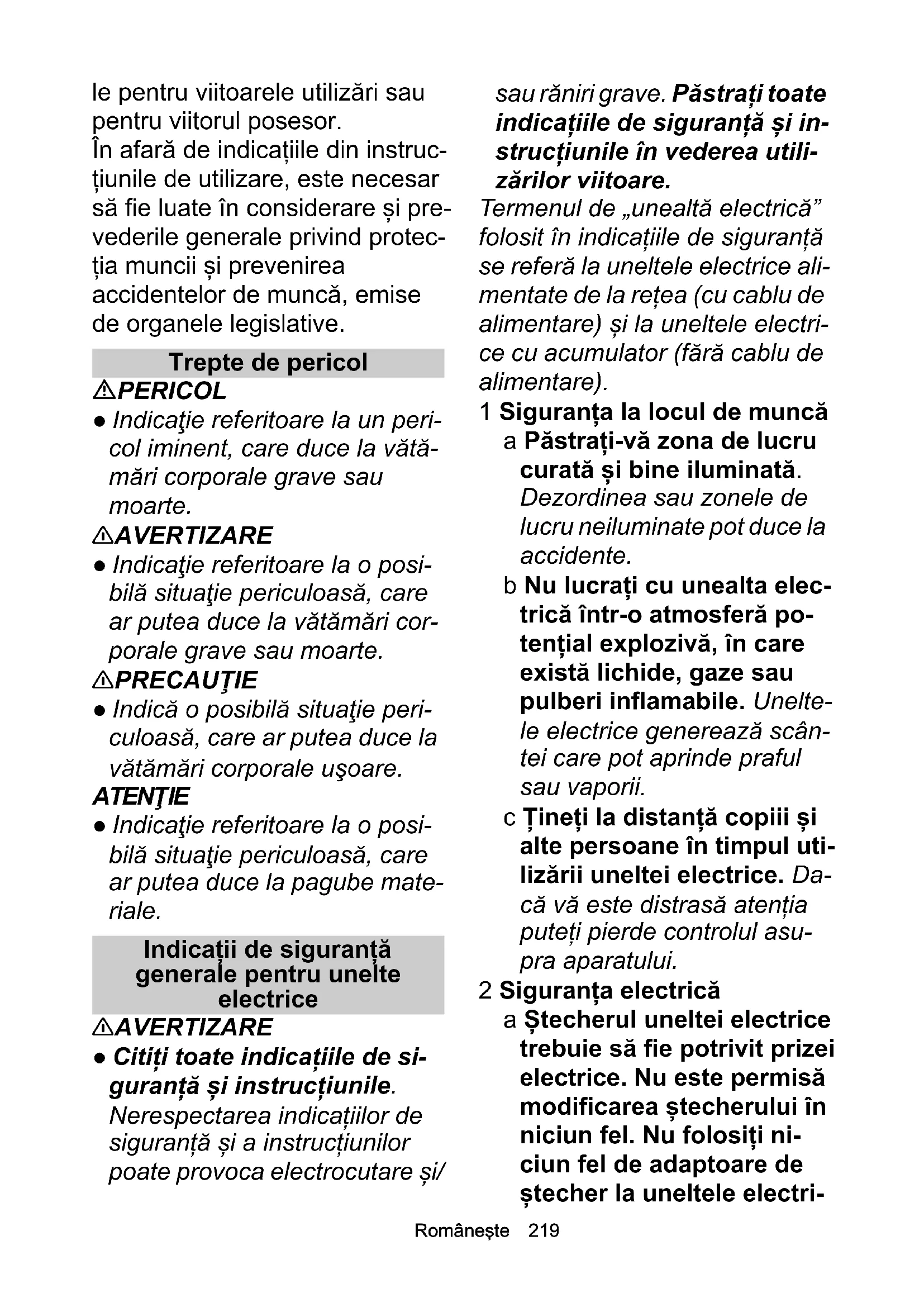 - Declaraţie de conformitate UE Chairman of the Board of ManagementDirector Regulatory Affairs & Certification H. Jenner S. ReiserRomâneşte 219 le pentru viitoarele utilizări sau pentru viitorul posesor. În afară de indicațiile din instruc- țiunile de utilizare, este necesar să fie luate în considerare și pre- vederile generale privind protec- ția muncii și prevenirea accidentelor de muncă, emise de organele legislative. Trepte de pericol PERICOL ● Indicaţie referitoare la un peri- col iminent, care duce la vătă- mări corporale grave sau moarte. 몇 AVERTIZARE ● Indicaţie referitoare la o posi- bilă situaţie periculoasă, care ar putea duce la vătămări cor- porale grave sau moarte. 몇 PRECAUŢIE ● Indică o posibilă situaţie peri- culoasă, care ar putea duce la vătămări corporale uşoare. ATENŢIE ● Indicaţie referitoare la o posi- bilă situaţie periculoasă, care ar putea duce la pagube mate- riale. Indicații de siguranță generale pentru unelte electrice 몇 AVERTIZARE ● Citiți toate indicațiile de si- guranță și instrucț iunile. Nerespectarea indicațiilor de siguranță și a instrucțiunilor poate provoca electrocutare și/ sau răniri grave. Păstrați toate indicațiile de siguranță și in- strucțiunile în vederea utili- zărilor viitoare. Termenul de „unealtă electrică” folosit în indicațiile de siguranță se referă la uneltele electrice ali- mentate de la rețea (cu cablu de alimentare) și la uneltele electri- ce cu acumulator (fără cablu de alimentare). 1 Siguranța la locul de muncă a Păstrați-vă zona de lucru curată și bine iluminată. Dezordinea sau zonele de lucru neiluminate pot duce la accidente. b Nu lucrați cu unealta elec- trică într-o atmosferă po- tențial explozivă, în care există lichide, gaze sau pulberi inflamabile. Unelte- le electrice generează scân- tei care pot aprinde praful sau vaporii. c Țineți la distanță copiii și alte persoane în timpul uti- lizării uneltei electrice. Da- că vă este distrasă atenția puteți pierde controlul asu- pra aparatului. 2 Siguranța electrică a Ștecherul uneltei electrice trebuie să fie potrivit prizei electrice. Nu este permisă modificarea ștecherului în niciun fel. Nu folosiți ni- ciun fel de adaptoare de ștecher la uneltele electri-220 Româneşte ce cu împământare. Ște- cherele originale și prizele adecvate reduc riscul de electrocutare. b Evitați contactul corpului cu suprafețe legate la pă- mânt cum sunt țevi, calori- fere, aparate de încălzit și frigidere. Există un risc ridi- cat de electrocutare în cazul în care corpul intră în con- tact cu împământarea. c Feriți uneltele electrice de ploaie sau umiditate. Pă- trunderea apei într-o unealtă electrică crește riscul de electrocutare. d Nu folosiți niciodată cablul în alte scopuri decât cele prevăzute, pentru a trans- porta, suspenda unealta electrică sau pentru a scoate ștecherul din priză. Feriți cablul de căldură, ulei, muchii ascuțite sau componente aflate în miș- care. Cablurile de conectare deteriorate sau răsucite cresc riscul de electrocutare. e Dacă lucrați în aer liber cu o unealtă electrică, folosiți numai cabluri prelungitoa- re adecvate și pentru folo- sirea în meniul exterior. Folosirea unui cablu prelun- gitor adecvat pentru mediul exterior reduce riscul de electrocutare. f Dacă nu se poate evita uti- lizarea uneltei electrice în mediu umed, folosiți un în- trerupător de protecție îm- potriva curenților reziduali. Utilizarea unui în- trerupător de protecție împo- triva curenților reziduali reduce riscul de electrocuta- re. 3 Siguranța persoanelor a Fiți atenți, aveți grijă la ce- ea ce faceți și procedați în mod rațional atunci când lucrați cu o unealtă electri- că. Nu folosiți o unealtă electrică dacă sunteți obo- sit sau vă aflați sub influ- ența drogurilor, alcoolului sau a medicamentelor. Un moment de neatenție în tim- pul utilizării uneltei electrice poate duce la răniri grave. p. 230