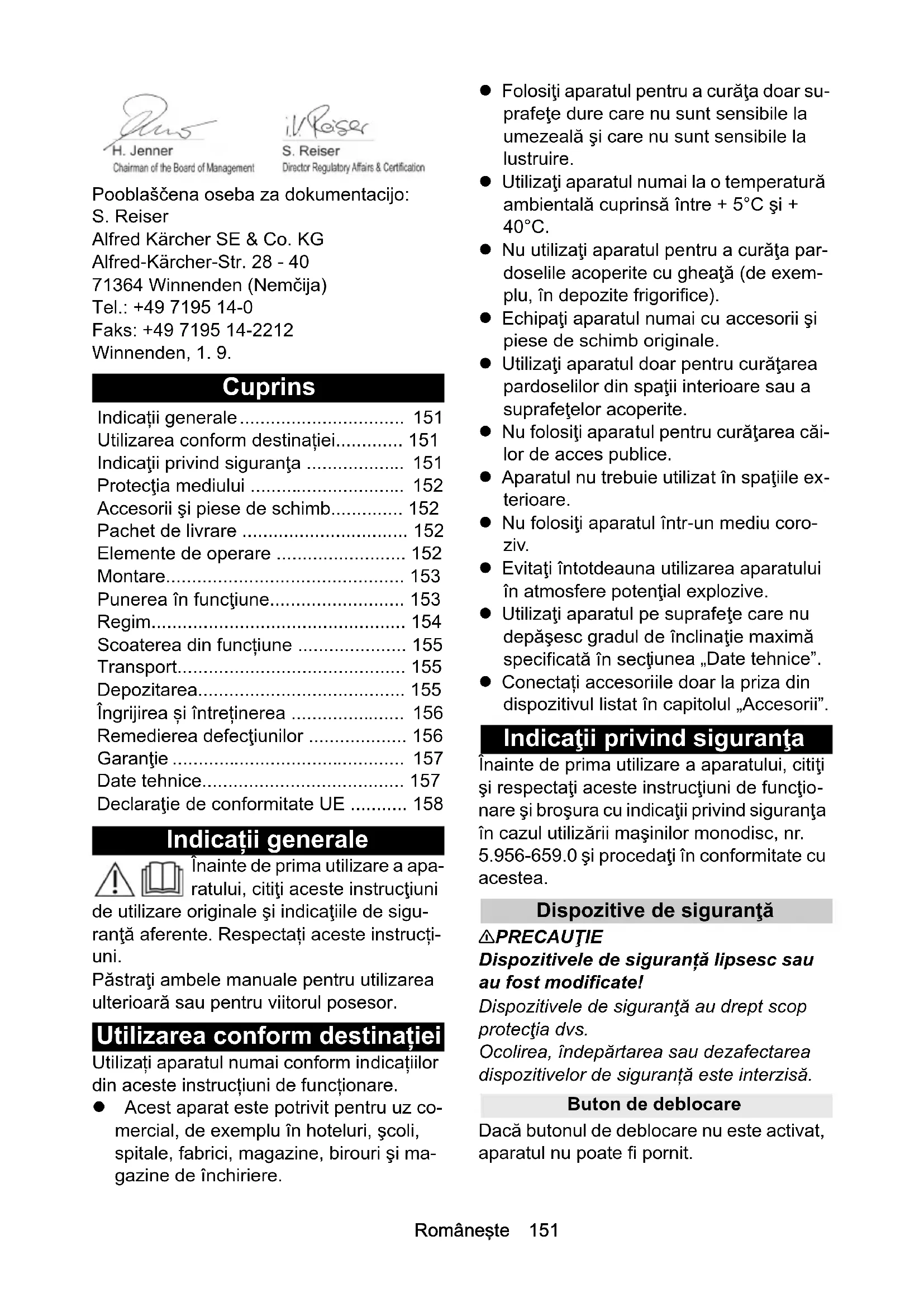 • dB(A) 86,9 BDP 43/400 CRomâneşte 151 Pooblaščena oseba za dokumentacijo: S. Reiser Alfred Kärcher SE & Co. KG Alfred-Kärcher-Str. 28 - 40 71364 Winnenden (Nemčija) Tel.: +49 7195 14-0 Faks: +49 7195 14-2212 Winnenden, 1. 9. Cuprins Indicații generale Înainte de prima utilizare a apa- ratului, citiţi aceste instrucţiuni de utilizare originale şi indicaţiile de sigu- ranţă aferente. Respectați aceste instrucți- uni. Păstraţi ambele manuale pentru utilizarea ulterioară sau pentru viitorul posesor. Utilizarea conform destinației Utilizați aparatul numai conform indicațiilor din aceste instrucțiuni de funcționare. Acest aparat este potrivit pentru uz co- mercial, de exemplu în hoteluri, şcoli, spitale, fabrici, magazine, birouri şi ma- gazine de închiriere. Folosiţi aparatul pentru a curăţa doar su- prafeţe dure care nu sunt sensibile la umezeală şi care nu sunt sensibile la lustruire. Utilizaţi aparatul numai la o temperatură ambientală cuprinsă între + 5°C şi + 40°C. Nu utilizaţi aparatul pentru a curăţa par- doselile acoperite cu gheaţă (de exem- plu, în depozite frigorifice). Echipaţi aparatul numai cu accesorii şi piese de schimb originale. Utilizaţi aparatul doar pentru curăţarea pardoselilor din spaţii interioare sau a suprafeţelor acoperite. Nu folosiţi aparatul pentru curăţarea căi- lor de acces publice. Aparatul nu trebuie utilizat în spaţiile ex- terioare. Nu folosiţi aparatul într-un mediu coro- ziv. Evitaţi întotdeauna utilizarea aparatului în atmosfere potenţial explozive. Utilizaţi aparatul pe suprafeţe care nu depăşesc gradul de înclinaţie maximă specificată în secţ iunea „Date tehnice”. Conectați accesoriile doar la priza din dispozitivul listat în capitolul „Accesorii”. Indicaţii privind siguranţa Înainte de prima utilizare a aparatului, citiţi şi respectaţi aceste instrucţiuni de funcţio- nare şi broşura cu indicaţii privind siguranţa în cazul utilizării maşinilor monodisc, nr. 5.956-659.0 şi procedaţi în conformitate cu acestea. Dispozitive de siguranţă 몇 PRECAUŢIE Dispozitivele de siguranță lipsesc sau au fost modificate! Dispozitivele de siguranţă au drept scop protecţia dvs. Ocolirea, îndepărtarea sau dezafectarea dispozitivelor de siguranță este interzisă. Buton de deblocare Dacă butonul de deblocare nu este activat, aparatul nu poate fi pornit. Indicații generale p. 151