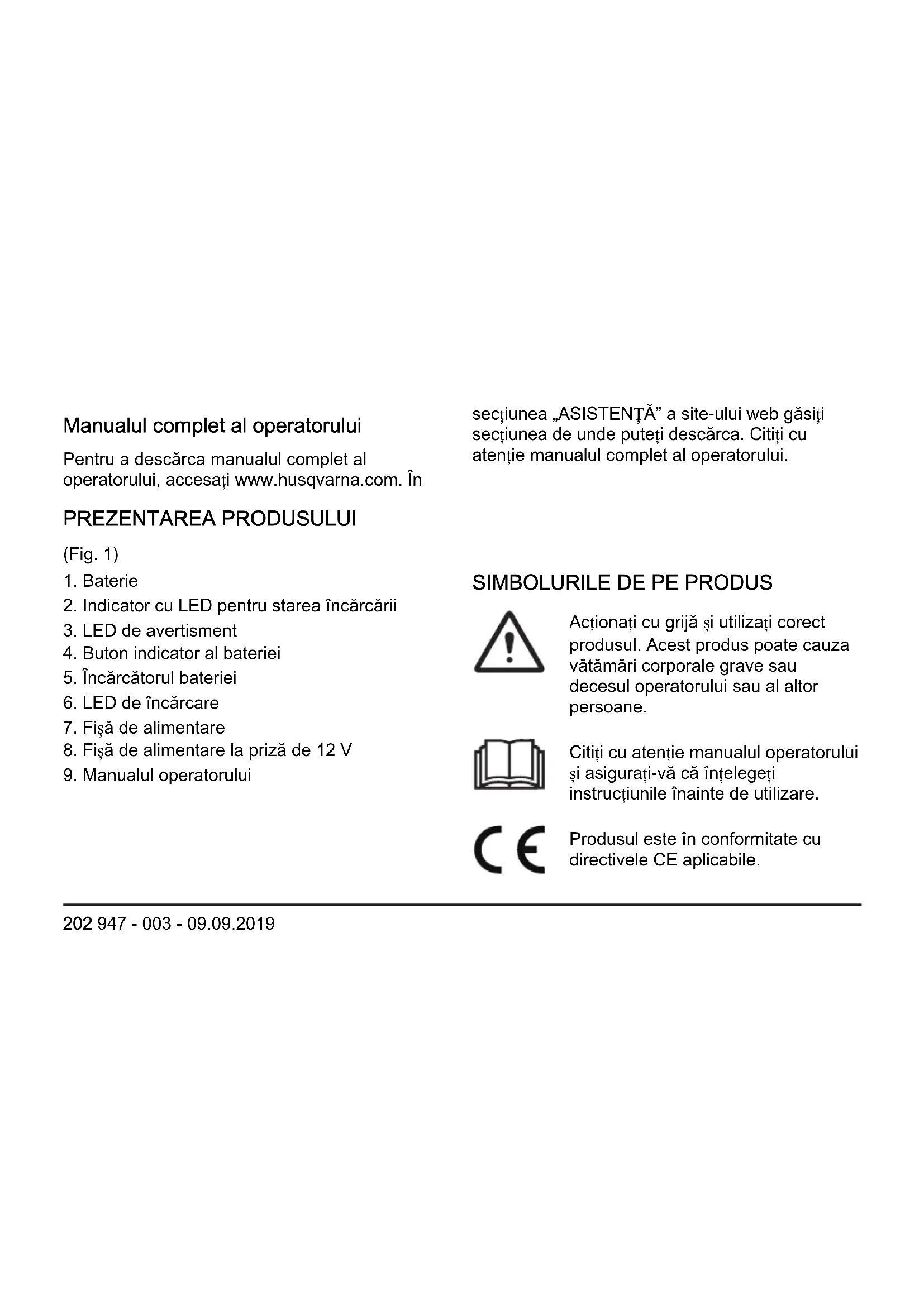 Acționați cu grijă și utilizați corect produsul. Acest produs poate cauza vătămări corporale grave sau decesul operatorului sau al altor persoane. Citiți cu atenție manualul operatorului și asigurați-vă că înțelegeți instrucțiunile înainte de utilizare. Produsul este în conformitate cu directivele CE aplicabile. 202 947 - 003 - 09.09.2019Produsul și ambalajul produsului nu pot fi tratate ca deșeuri menajere. Reciclați-l la o locație de eliminare aprobată pentru echipamente electrice și electronice. Feriți unitatea de apă și ploaie. Utilizați și păstrați încărcătorul bateriei numai în interior. Nota: Alte simboluri/autocolante de pe produs se referă la cerințele de certificare pentru unele zone comerciale.