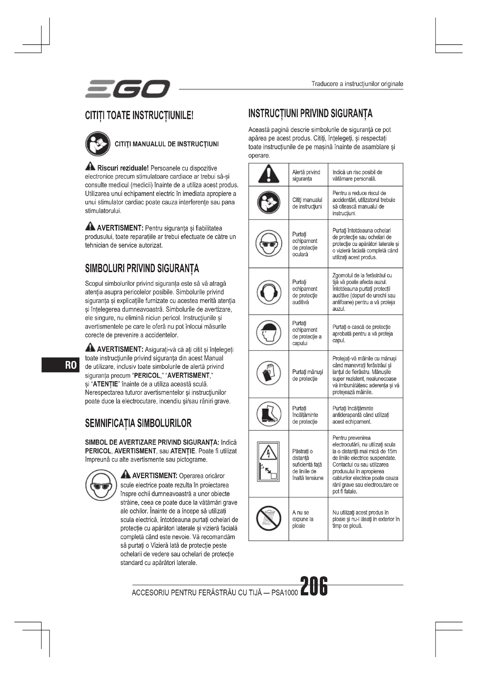 Manevrarea corespunzătoare a ferăstrăului cu tijă va reduce probabilitatea unui contact accidental cu lanţul în mişcare al ferăstrăului. ◾ Nu îndepărtaţi materialul tăiat şi nu ţineţi de materialul ce trebuie tăiat când lamele sunt în mişcare. Asiguraţi-vă că opriţi trimmerul când îndepărtaţi materialul blocat. Lanțul ferăstrăului continuă să se rotească după oprirea ferăstrăului. Un moment de neatenţie în timp ce utilizaţi ferăstrăul cu tijă se poate solda cu vătămări personale grave. ◾ Respectaţi instrucţiunile privind ungerea, tensionarea lanţului şi schimbarea accesoriilor. Lanţul lubriat sau tensionat necorespunzător se poate rupe sau poate creşte posibilitatea de recul. Păstrați muchia de tăiere ascuțită și curată pentru performanțe optime și pentru a reduce riscul de rănire. ◾ Menţineţi mânerele uscate, curate şi fără ulei şi vaselină. Mânerele unsuroase sau uleioase sunt alunecoase, provocând pierderea controlului. ◾ Tăiaţi numai lemn. Nu utilizaţi ferăstrăul cu tijă în alt scop în afara celui pentru care este destinat. De exemplu: nu utilizaţi ferăstrăul cu tijă pentru tăierea plasticului, zidăriei sau a materialelor de construcţii nelemnoase. Utilizarea ferăstrăului cu tijă pentru alte operaţiuni decât cele pentru care a fost conceput poate duce la situaţii periculoase. ◾ Evitați utilizarea ferăstrăului cu tijă în condiții meteo defavorabile, în special când este risc de fulgere. Astfel veți diminua riscul de a lovit(ă) de fulger. ◾ De ecare dată când plecați de lângă sculă, opriți motorul și îndepărtați setul de acumulatori. ◾ Depozitați aparatele care nu sunt în funcțiune în interior. Când nu sunt utilizate, aparatele trebuie depozitate în interior, într-un loc uscat și la înălțime, sau închis cu cheia cu setul de acumulatori detașat, inaccesibil copiilor. ◾ Vericaţi pentru depistarea componentelor avariate. Înainte de a continua utilizarea produsului, apărătoarea sau altă piesă care este deteriorată trebuie vericată cu atenţie pentru a determina dacă va funcţiona corespunzător şi îşi va îndeplini funcţia desemnată. Vericaţi coaxialitatea pieselor în mişcare, neobstrucționarea pieselor în mişcare, defectări ale pieselor, montajul şi orice altă situaţie care poate afecta funcţionarea sculei. Apărătoarea sau altă piesă care este deteriorată trebuie reparată corect sau înlocuită de către un centru de service autorizat, cu excepţia cazului când se indică contrariul în acest manual de instrucţiuni. AVERTISMENTE SUPLIMENTARE ◾ Nu încărcaţi setul de acumulatori în condiţii de ploaie sau de umezeală. ◾ Utilizați numai seturile de acumulatori și încărcătorii din g.A. ◾ Setul de acumulatori trebuie scos din aparat înainte de eliminarea acestuia. ◾ Acumulatorul trebuie eliminat într-un mod nepericulos. ◾ Nu eliminați acumulatorii aruncându-i în foc. Celulele riscă să explodeze. Vericați normele locale privind eventualele instrucțiuni speciale de eliminare. ◾ Nu desfaceți sau să mutilați acumulatorul. Electrolitul eliberat este coroziv și poate afecta ochii și pielea. Acesta poate toxic dacă este înghițit. ATENŢIE! Electrolitul este un acid sulfuric diluat care este dăunător pielii și ochilor. Acesta este un conductor electric și coroziv. ◾ Atenție când manevrați acumulatori pentru a scurtcircuita acumulatorul cu materiale conductoare precum inele, brățări și chei. Acumulatorul sau conductorul se pot supraîncălzi și cauza arsuri. ◾ Sculele electrice alimentate cu baterii nu trebuie să e racordate la o priză electrică, de aceea, acestea sunt întotdeauna în stare de funcționare. Atenție la eventualele riscuri chiar și când scula nu este în funcțiune. Aveți grijă când efectuați operații de întreținere sau de service. ◾ Îndepărtați setul de acumulatori înainte de a efectua operațiuni de service de a curăța sau de a îndepărta materiale din sculă. ◾ Piesele de schimb - În cazul operațiilor de service, utilizaţi numai piese de schimb EGO identice. Utilizarea oricăror alte accesorii sau componente poate crește riscul de rănire. ◾ Nu spălați trimmerul cu furtunul de grădină; evitați pătrunderea apei în motor și în conexiunile electrice. ◾ În cazul situațiilor care nu sunt adresate în acest manual, utilizați grijă și raționament. Contactați centrul de service EGO pentru asistență. ◾ Păstraţi aceste instrucţiuni. Consultaţi-le frecvent şi utilizaţi-le pentru a instrui alte persoane care ar putea utiliza această sculă electrică. Dacă împrumutați cuiva această sculă, împrumutați-i și aceste instrucțiuni pentru a preveni utilizarea inadecvată a produsului și posibile răniri.ACCESORIU PENTRU FERĂSTRĂU CU TIJĂ — PSA1000 211