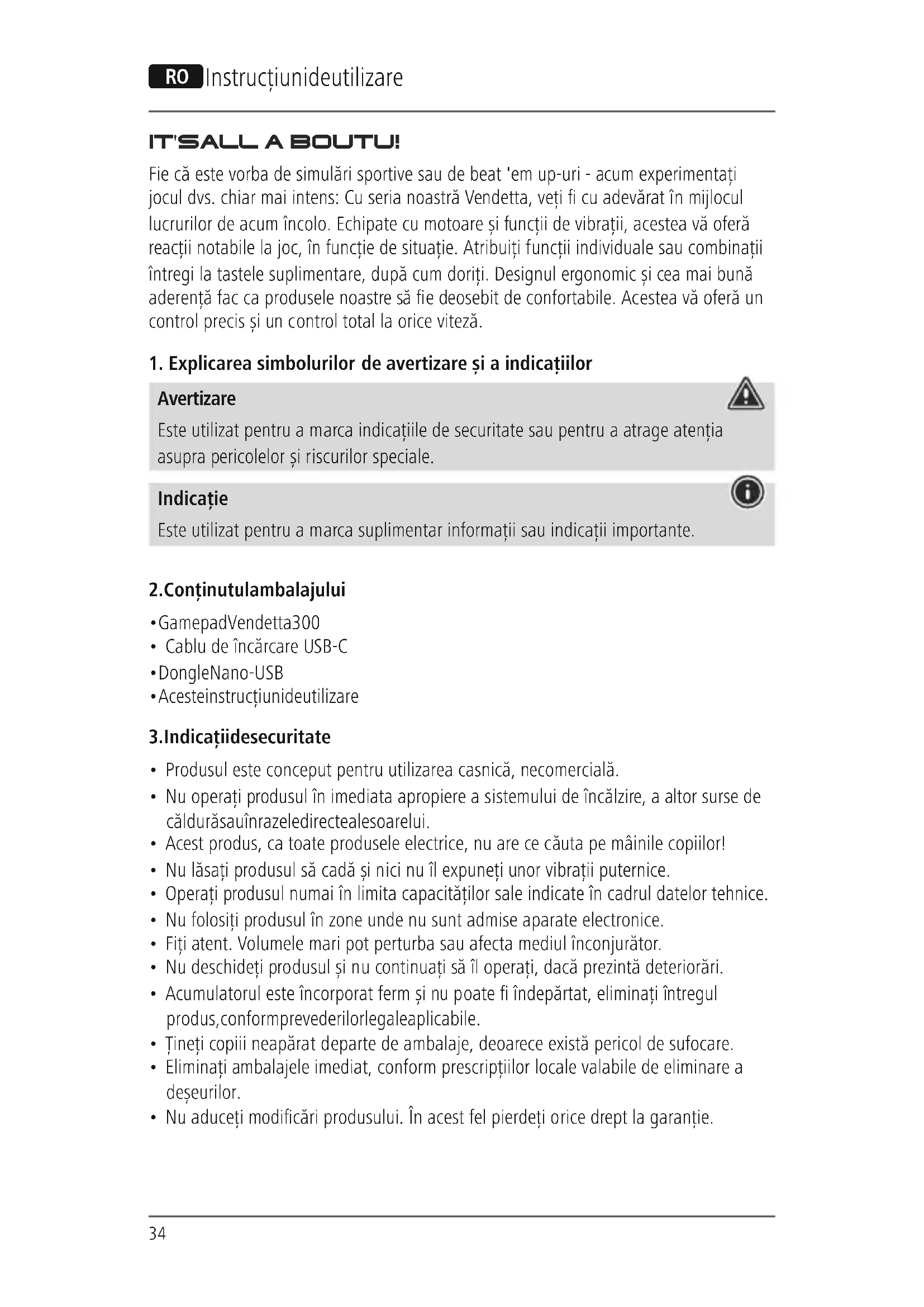 AHama GmbH &CoKGigazolja, hogy a[00186075] típusú rádióberendezés megfelel a2014/53/EU irányelvnek. Az EU-megfelelőségi nyilatkozat teljes szövege elérhető akövetkező internetes címen: www.hama. com->00186075->Downloads. Frekvenciasáv(ok) 2400 –2483 MHz Maximális sugárzott jelerősség 0dBm34 M Instrucțiuni de utilizare IT'S ALLABOUT U! Fie că este vorba de simulări sportive sau de beat 'em up-uri -acum experimentați jocul dvs. chiar mai intens: Cu seria noastră Vendetta, veți cu adevăratînmijlocul lucrurilor de acum încolo. Echipate cu motoare șifuncții de vibrații, acestea vă oferă reacții notabile la joc, în funcție de situație. Atribuițifuncții individuale sau combinații întregi la tastele suplimentare, după cum doriți. Designul ergonomic șicea mai bună aderență fac ca produsele noastresăedeosebit de confortabile. Acestea vă oferă un control precis șiuncontrol total la orice viteză.