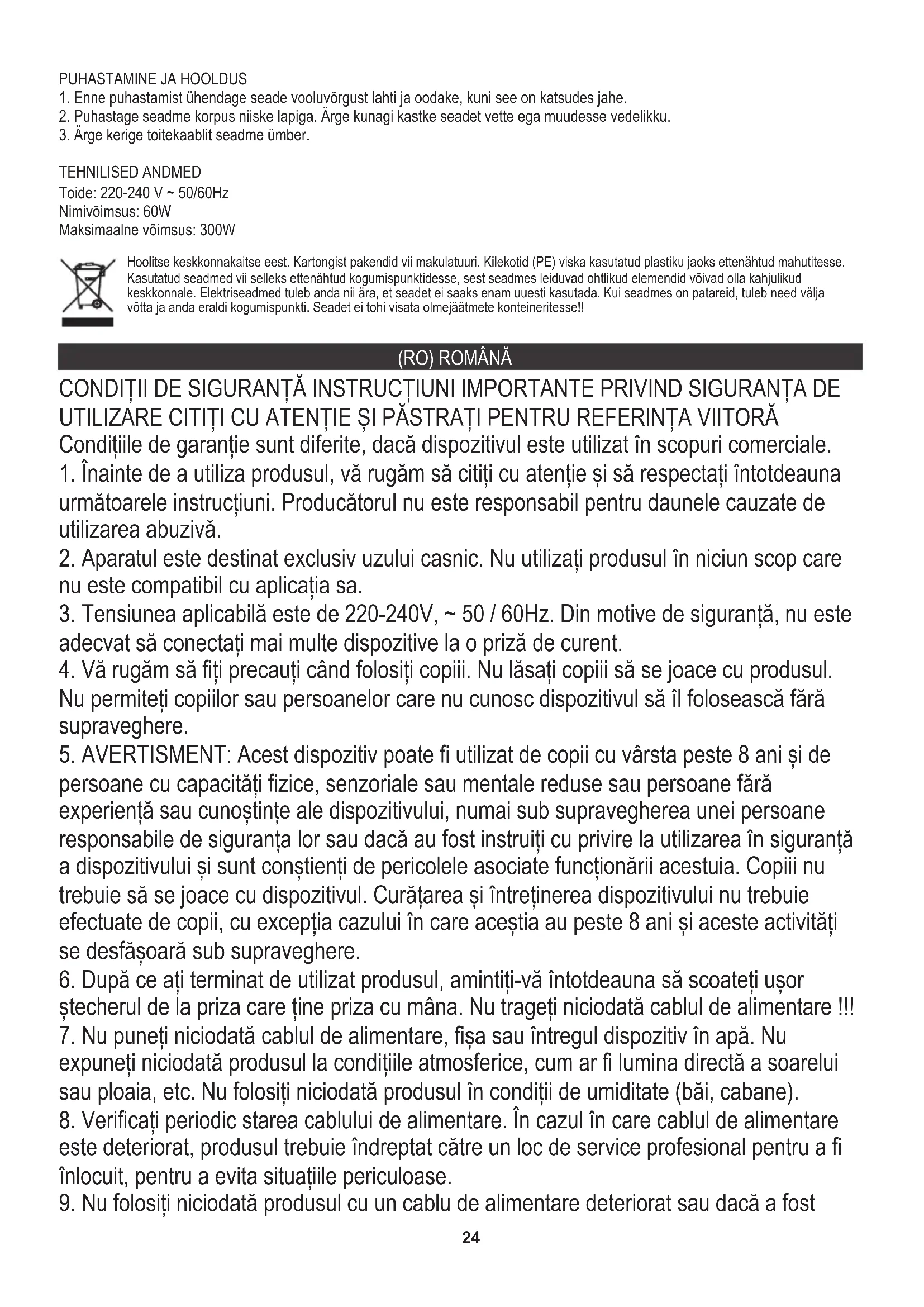 2. Aparatul este destinat exclusiv uzului casnic. Nu utilizați produsul în niciun scop care