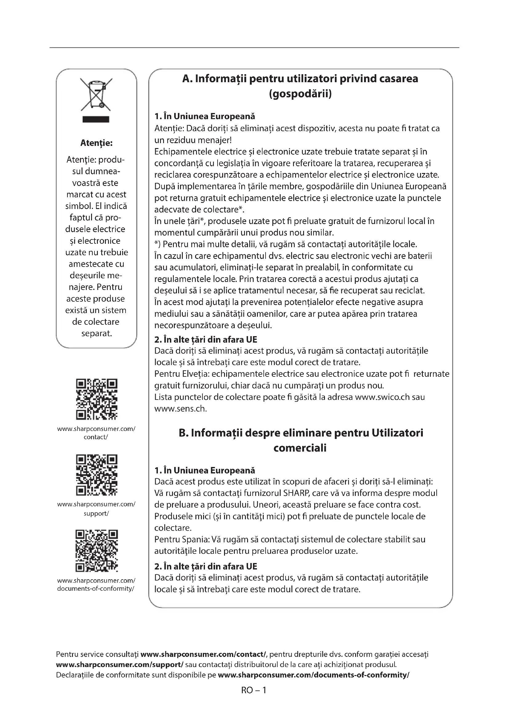 Dacă doriți să eliminați acest produs, vă rugăm să contactați autoritățile locale și să întrebați care este modul corect de tratare. Pentru service consultaţi www.sharpconsumer.com/contact/, pentru drepturile dvs. conform garației accesaţi www.sharpconsumer.com/support/ sau contactaţi distribuitorul de la care aţi achiziţionat produsul. Declaraţiile de conformitate sunt disponibile pe www.sharpconsumer.com/documents-of-conformity/ www.sharpconsumer.com/ support/ www.sharpconsumer.com/ documents-of-conformity/ www.sharpconsumer.com/ contact/ RO – 2 RO – 2 PRECAUȚII PENTRU A EVITA EXPUNEREA POSIBILĂ LA ENERGIA CU MICROUNDE