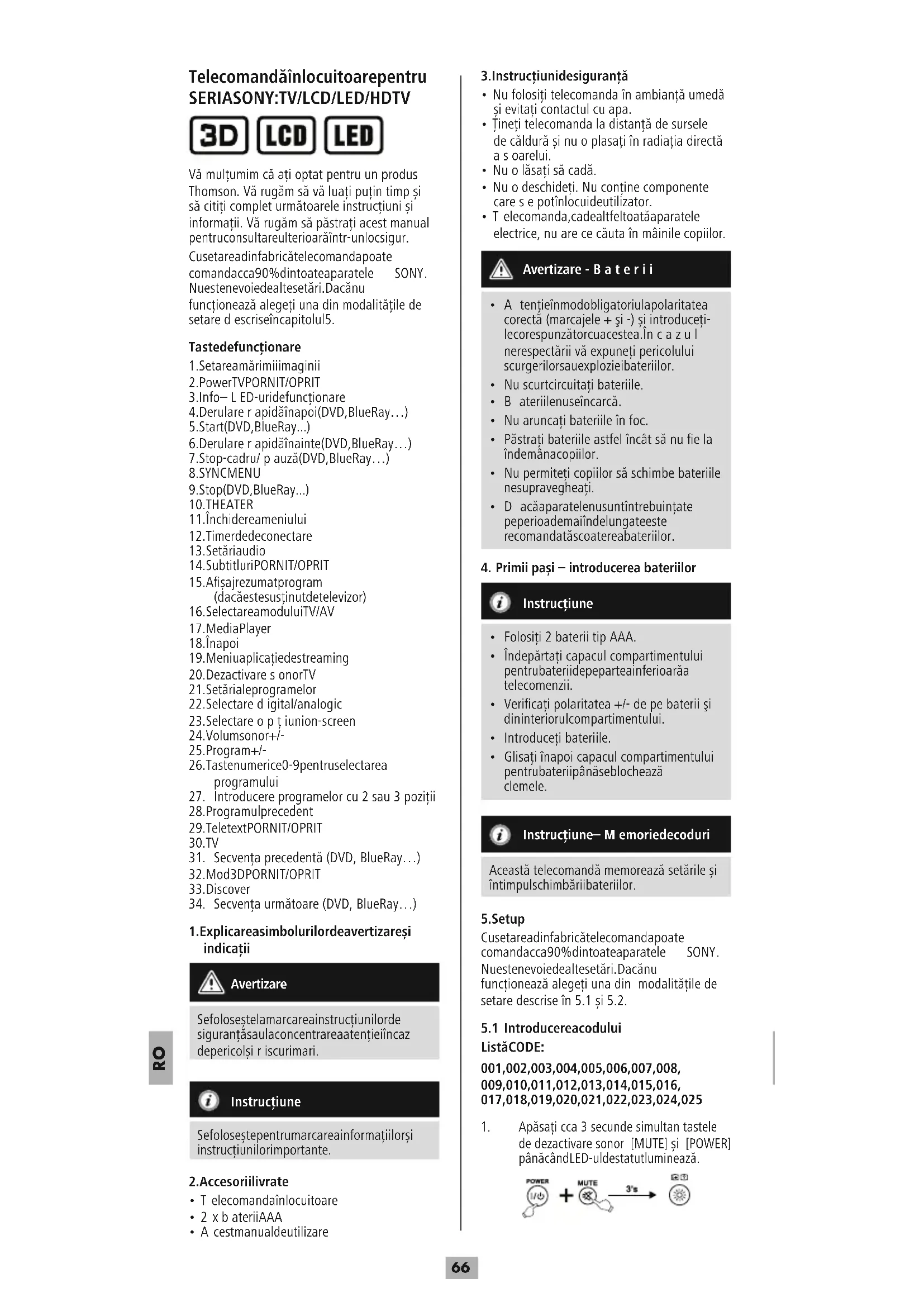 Vă mulţumim că aţioptat pentru un produs Thomson. Vă rugămsăvăluațipuțin timp și să citițicomplet următoarele instrucțiuni și informații. Vă rugămsăpăstraţiacest manual pentru consultare ulterioară într-un loc sigur. Cu setarea din fabrică telecomanda poate comanda cca 90% din toate aparatele SONY