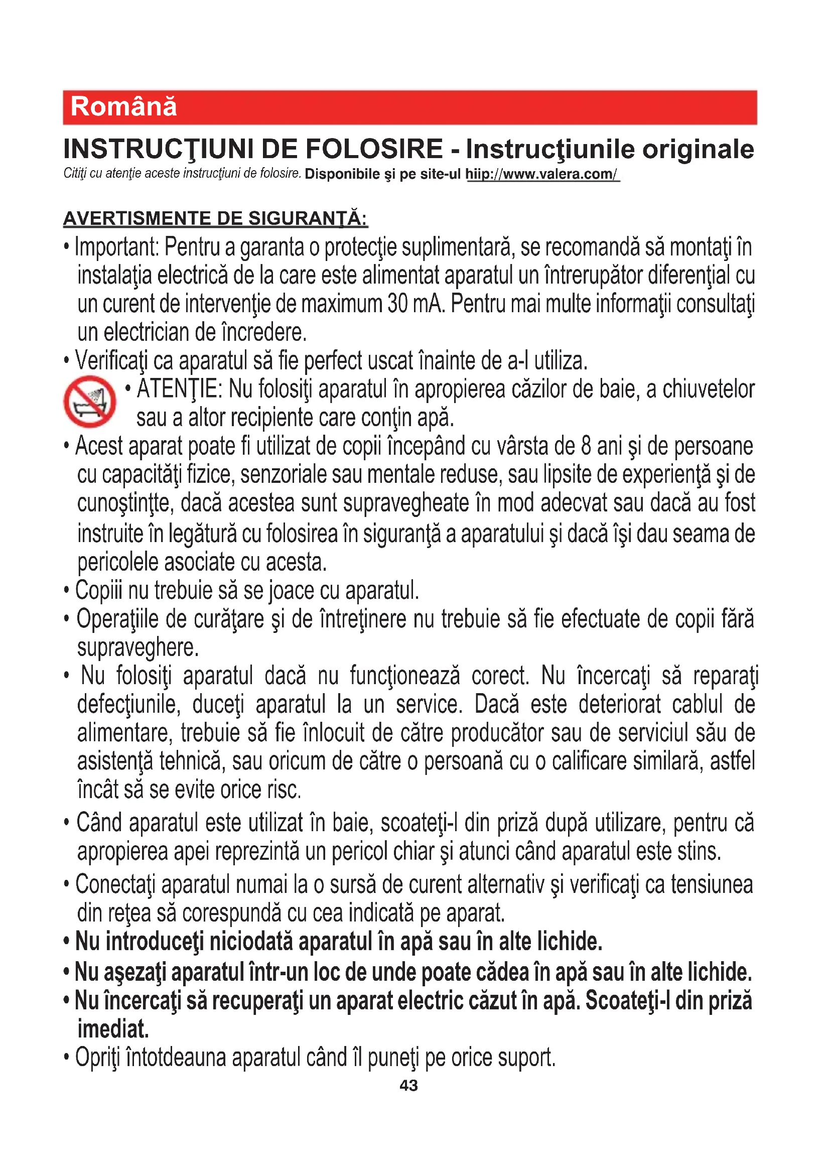 Română INSTRUCŢIUNI DE FOLOSIRE - Instrucţiunile originale Citiţi cu atenţie aceste instrucţiuni de folosire. Disponibile şi pe site-ul hiip://www.valera.com/ AVERTISMENTE DE SIGURANŢĂ: