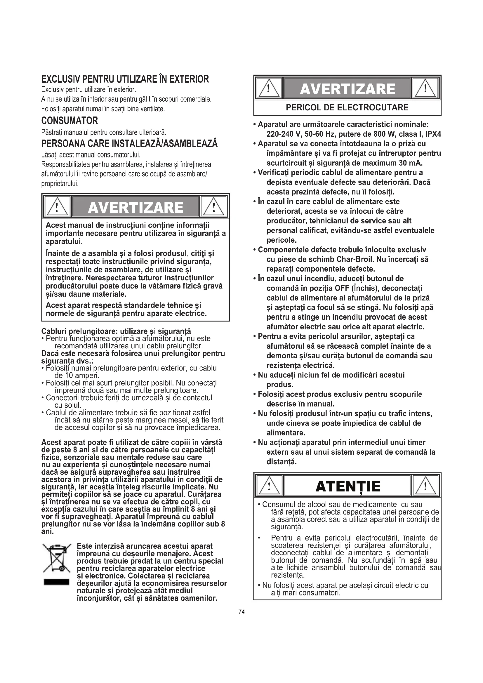Lăsați acest manual consumatorului.Responsabilitatea pentru asamblarea, instalarea și întreținerea afumătorului îi revine persoanei care se ocupă de asamblare/proprietarului.Cabluri prelungitoare: utilizare și siguranță• Pentru funcționarea optimă a afumătorului, nu esterecomandată utilizarea unui cablu prelungitor.Dacă este necesară folosirea unui prelungitor pentru siguranța dvs.:• Folosiți numai prelungitoare pentru exterior, cu cablude 10 amperi.• Folosiți cel mai scurt prelungitor posibil. Nu conectațiîmpreună două sau mai multe prelungitoare.• Conectorii trebuie feriți de umezeală și de contactulcu solul.• Cablul de alimentare trebuie să fie poziționat astfelîncât să nu atârne peste marginea mesei, să fie feritde accesul copiilor și să nu provoace împiedicarea.Acest aparat poate fi utilizat de către copiii în vârstă de peste 8 ani și de către persoanele cu capacități fizice, senzoriale sau mentale reduse sau care nu au experiența și cunoștințele necesare numai dacă se asigură supravegherea sau instruirea acestora în privința utilizării aparatului în condiții de siguranță, iar aceștia înțeleg riscurile implicate. Nu permiteți copiilor să se joace cu aparatul. Curățarea și întreținerea nu se va efectua de către copii, cu excepția cazului în care aceștia au împlinit 8 ani și vor fi supravegheați. Aparatul împreună cu cablul prelungitor nu se vor lăsa la îndemâna copiilor sub 8 ani. Este interzisă aruncarea acestui aparat împreună cu deșeurile menajere. Acest produs trebuie predat la un centru special pentru reciclarea aparatelor electrice și electronice. Colectarea și reciclarea deșeurilor ajută la economisirea resurselor naturale și protejează atât mediul înconjurător, cât și sănătatea oamenilor.• Aparatul are următoarele caracteristici nominale:220-240 V, 50-60 Hz, putere de 800 W, clasa I, IPX4• Aparatul se va conecta întotdeauna la o priză cuîmpământare și va fi protejat cu întreruptor pentruscurtcircuit și siguranță de maximum 30 mA.• Verificați periodic cablul de alimentare pentru adepista eventuale defecte sau deteriorări. Dacăacesta prezintă defecte, nu îl folosiți.• În cazul în care cablul de alimentare estedeteriorat, acesta se va înlocui de cătreproducător, tehnicianul de service sau altpersonal calificat, evitându-se astfel eventualelepericole.• Componentele defecte trebuie înlocuite exclusivcu piese de schimb Char-Broil. Nu încercați săreparați componentele defecte.• În cazul unui incendiu, aduceți butonul decomandă în poziția OFF (Închis), deconectațicablul de alimentare al afumătorului de la prizăși așteptați ca focul să se stingă. Nu folosiți apăpentru a stinge un incendiu provocat de acestafumător electric sau orice alt aparat electric.• Pentru a evita pericolul arsurilor, așteptați caafumătorul să se răcească complet înainte de ademonta și/sau curăța butonul de comandă saurezistența electrică.• Nu aduceți niciun fel de modificări acestuiprodus.• Folosiți acest produs exclusiv pentru scopuriledescrise în manual.• Nu folosiți produsul într-un spațiu cu trafic intens,unde cineva se poate împiedica de cablul dealimentare.• Nu acționați aparatul prin intermediul unui timerextern sau al unui sistem separat de comandă ladistanță.Acest manual de instrucțiuni conține informații importante necesare pentru utilizarea în siguranță a aparatului.Înainte de a asambla și a folosi produsul, citiți și respectați toate instrucțiunile privind siguranța, instrucțiunile de asamblare, de utilizare și întreținere. Nerespectarea tuturor instrucțiunilor producătorului poate duce la vătămare fizică gravă și/sau daune materiale.Acest aparat respectă standardele tehnice și normele de siguranță pentru aparate electrice.