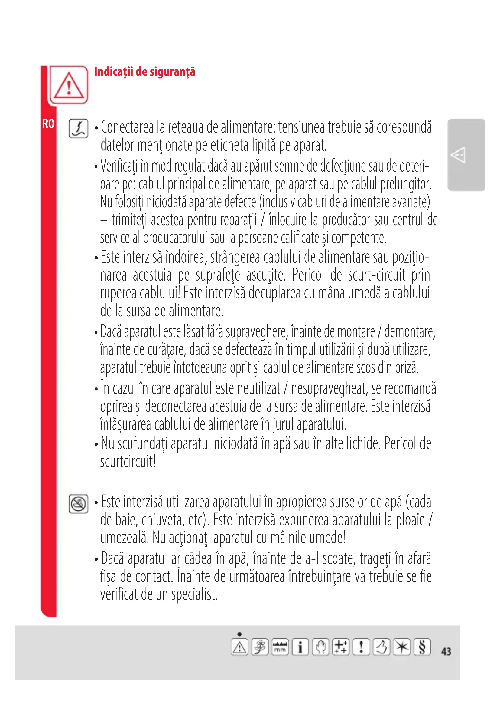- Este interzisă utilizarea aparatului în apropierea surselor de apă (cada de baie, chiuveta, etc). Este interzisă expunerea aparatului la ploaie / umezeală. Nu acţionaţi aparatul cu mâinile umede!44 RORO Indicaţii de siguranţă