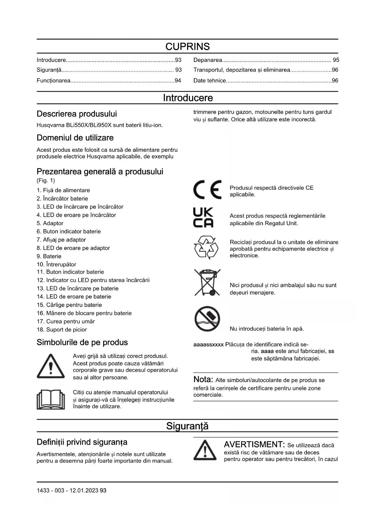 - Date tehnice Introducere Descrierea produsului Husqvarna BLi550X/BLi950X sunt baterii litiu-ion. Domeniul de utilizare Acest produs este folosit ca sursă de alimentare pentru produsele electrice Husqvarna aplicabile, de exemplu trimmere pentru gazon, motounelte pentru tuns gardul viu și suflante. Orice altă utilizare este incorectă. Prezentarea generală a produsului (Fig. 1) p. 96