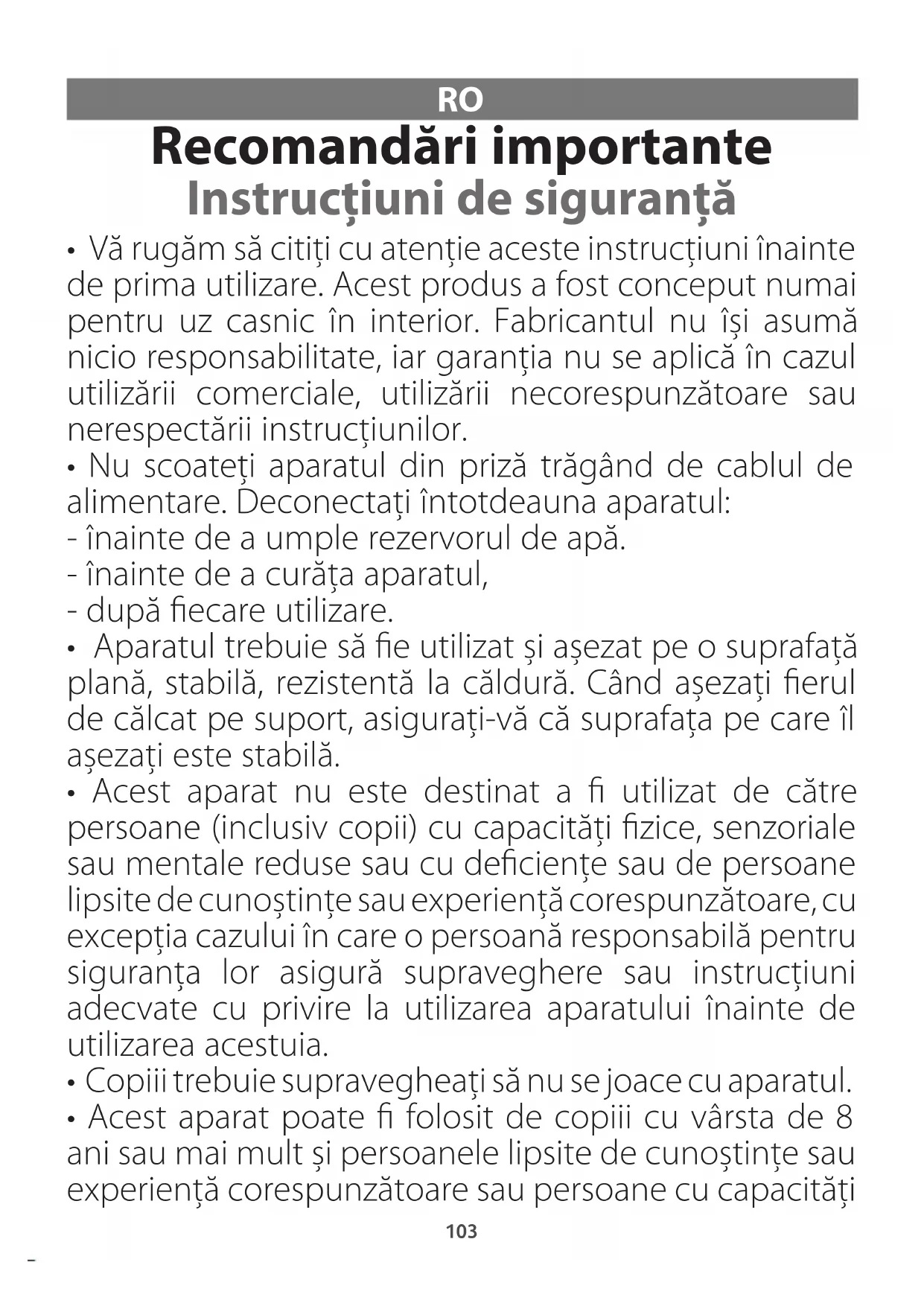 - Acest aparat poate folosit de copiii cu vârsta de 8 ani sau mai mult și persoanele lipsite de cunoștințe sau experiență corespunzătoare sau persoane cu capacități104 zice, senzoriale sau mentale reduse sau cu deciențe, cu condiția ca acestea să fost instruite complet în ceea ce privește utilizarea aparatului, să e supravegheate și să înțeleagă riscurile implicate. Copiii nu trebuie să se joace cu aparatul. Curățarea și întreținerea nu se vor face de către copii fără supraveghere. Nu lăsaţi erul de călcat şi cablul său de alimentare la îndemâna copiilor cu vârste mai mici de 8 ani atunci când se aă sub tensiune sau în curs de răcire.
