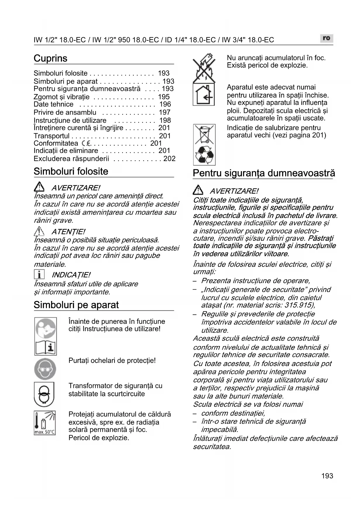 Folosiţi detectoare adecvate pentru a depista conductori şi conducte de alimentare ascunse sau adresaţivă în acest scop regiei locale furnizoare de utilităţi. Atingerea conductorilor electrici poate duce la incendiu şi electrocutare. Deteriorarea unei conducte de gaz poate duce la explozie. Străpungerea unei conducte de apă provoacă pagube materiale. Opriţi imediat scula electrică dacă dispozitivul de lucru se blochează. Fiţi pregătiţi la reculul generat de acest blocaj. Dispozitivul de lucru se blochează dacă: – scula electrică este suprasolicitată sau – este răsucită în piesa de lucru. Apucaţi strâns scula electrică. În timpul înşurubării şi deşurubării de şuruburi pentru scurt timp pot apărea reacţii puternice. Asiguraţi piesa de lucru. O piesă de lucru fixată cu dispozitive de prindere sau într-o menghină este ţinută mai sigur decât cu mâna dumneavoastră. Înainte de a pune jos scula electrică aşteptaţi ca aceasta să se oprească complet. Dispozitivul de lucru se poate agăţa şi duce la pierderea controlului asupra sculei electrice. Utilizaţi numai acumulatoare originale cu tensiunea indicată pe plăcuţa de fabricaţie a sculei electrice aflate în posesia dumneavoastră. În caz de folosire a altor acumulatoare, de ex. produse contrafăcute, acumulatoare modificate sau produse de altă provenienţă, apare pericol de vătămări, precum şi de prejudicii materiale cauzate de explozia acumulatoarelor. Indicaţii de securitate privind lucrul cu acumulatoarele Nu deschideţi acumulatorul. Există pericol de scurtcircuit. Feriţi acumulatorul de căldură, de asemeni deex. de radiaţii solare continue, foc, apă şi umezeală. Există pericol de explozie. În cazul deteriorării sau utilizării necorespunzătoare a acumulatorului se pot degaja vapori. Aerisiţi cu aer proaspăt iar dacă vi se face rău consultaţi un medic. Vaporii pot irita căile respiratorii. În caz de utilizare greşită, din acumulator se poate scurge lichid. Evitaţi contactul cu acesta. În caz de contact accidental clătiţi bine cu apă. Dacă lichidul vă intră în ochi, consultaţi şi un medic. Lichidul scurs din acumulator poate duce la iritaţii ale pielii sau la arsuri. Încărcaţi acumulatorii numai în încărcăto- arele recomandate de producător. Dacă un încărcător destinat unui anumit tip de acumulator este folosit la încărcarea altor tipuri de acumulator decât cele prevăzute pentru el, există pericol de incendiu. În urma contactului cu obiecte ascuţite ca de exemplu cuie sau şurubelniţe sau prin acţiunea unor forţe exterioare asupra sa, acumulatorul se poate deteriora. Se poate produce un scurtcircuit intern în urma căruia acumulatorul să se aprindă, să scoată fum, să explodeze sau să se supraîncălzească.IW 1/2" 18.0-EC / IW 1/2" 950 18.0-EC / ID 1/4" 18.0-EC / IW 3/4" 18.0-EC