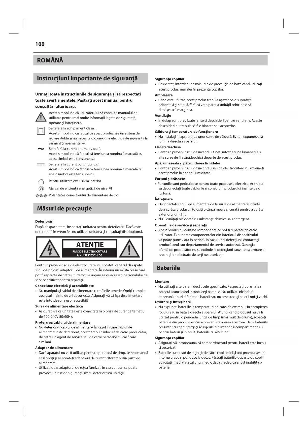 - Nu utilizați alte baterii decât cele speci cate. Respectați polaritatea corectă atunci când introduceți bateriile. Nu utilizați niciodată împreună tipuri diferite de baterii sau nu amestecați baterii noi și vechi. Utilizare și întreținere