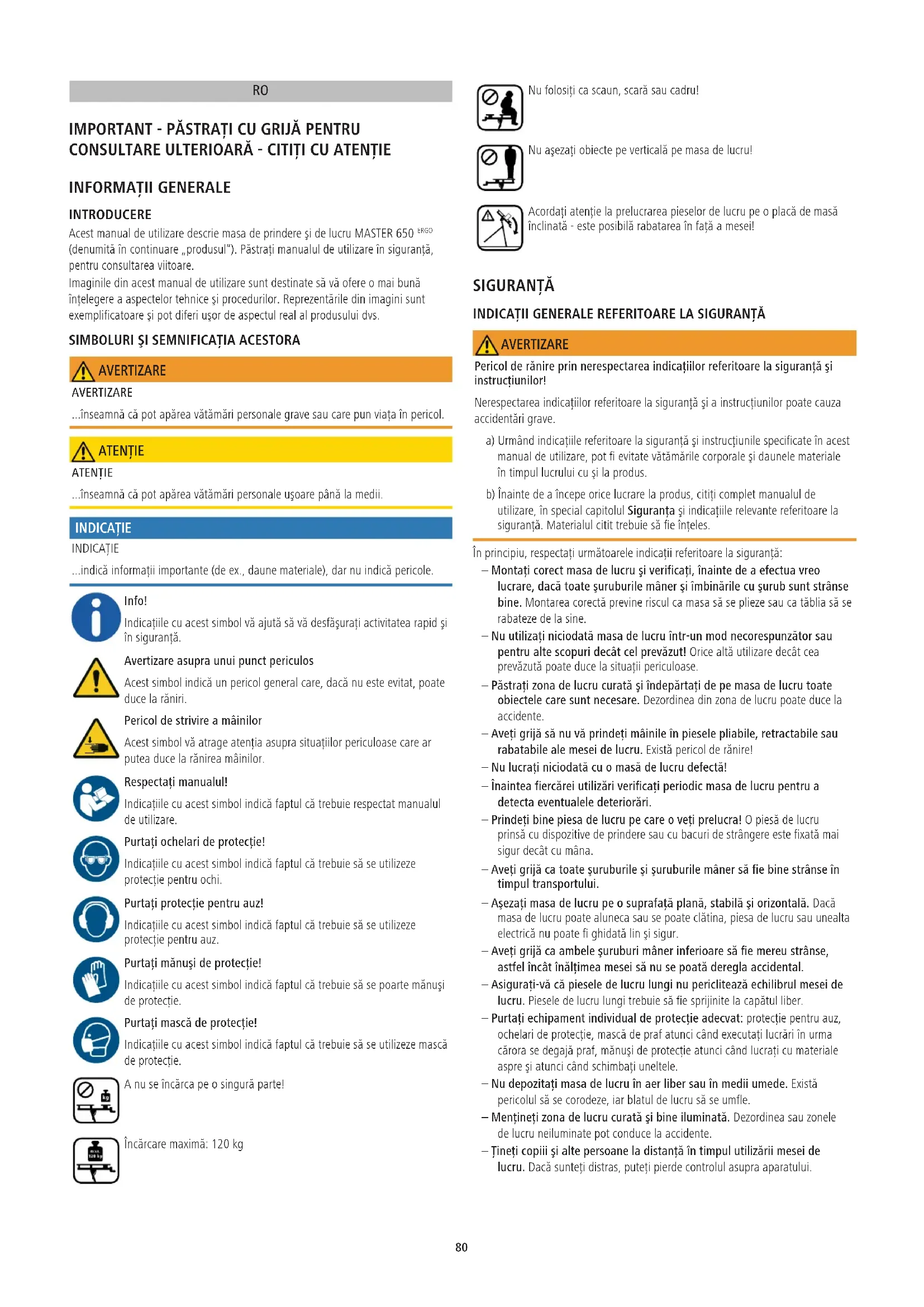 INTRODUCERE Acest manual de utilizare descrie masa de prindere şi de lucru MASTER 650 ERGO (denumită în continuare „produsul”). Păstraţi manualul de utilizare în siguranţă, pentru consultarea viitoare. Imaginile din acest manual de utilizare sunt destinate să vă ofere o mai bună înţelegere a aspectelor tehnice şi procedurilor. Reprezentările din imagini sunt exemplificatoare şi pot diferi uşor de aspectul real al produsului dvs.