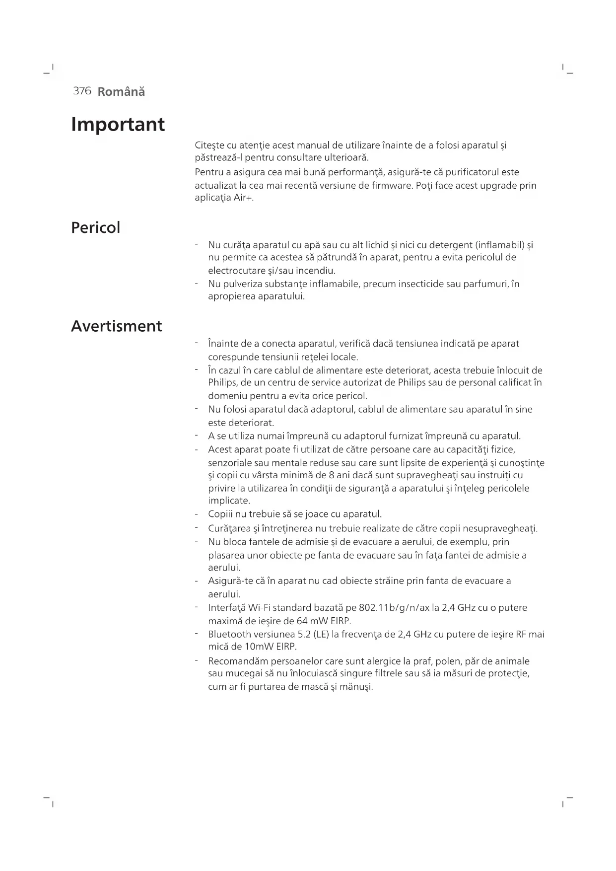 - Recomandam personelor care sunt alergice la graf, polen, pär de animale sau mucegai să nu înlocuiasca singure filtrele sau să ia măsuri de protectie, cum ar fi purtarea de mascași manusi. Acest aparat nu este un înlocuitor pentru aeresirea corespunzătoare, curățarea regulata cu aspiratorul sau Utilizarea unei hote absorbante ori a unui ventilator in timpul gătitului.