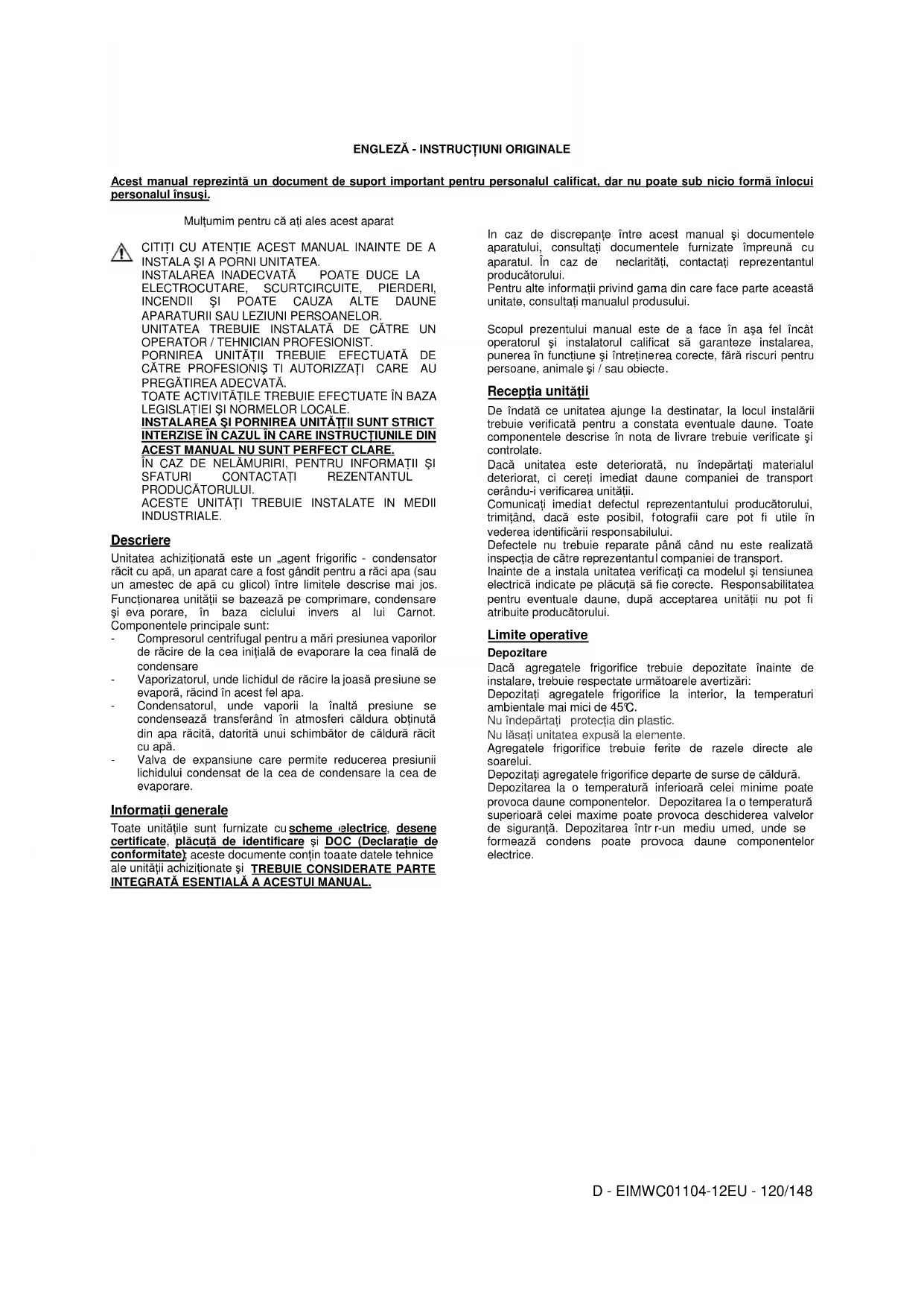 EIMWC01104 -12EU - 120/148 un document de suport important pentru personalul calificat, dar nu poate sub nicio formă înlocui e între acest manual şi documentele i documentele furnizate împreună cu neclarităŃi, contactaŃi reprezentantul ii privind gama din care face parte această i manualul produsului.