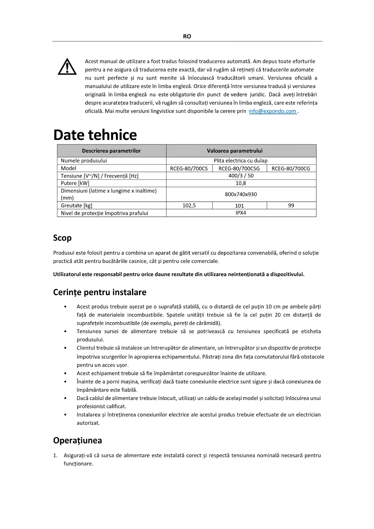 Scop Produsul este folosit pentru a combina un aparat de gătit versatil cu depozitarea convenabilă, oferind o soluție practică atât pentru bucătăriile casnice, cât și pentru cele comerciale. Utilizatorul este responsabil pentru orice daune rezultate din utilizarea neintenționată a dispozitivului. Cerințe pentru instalare