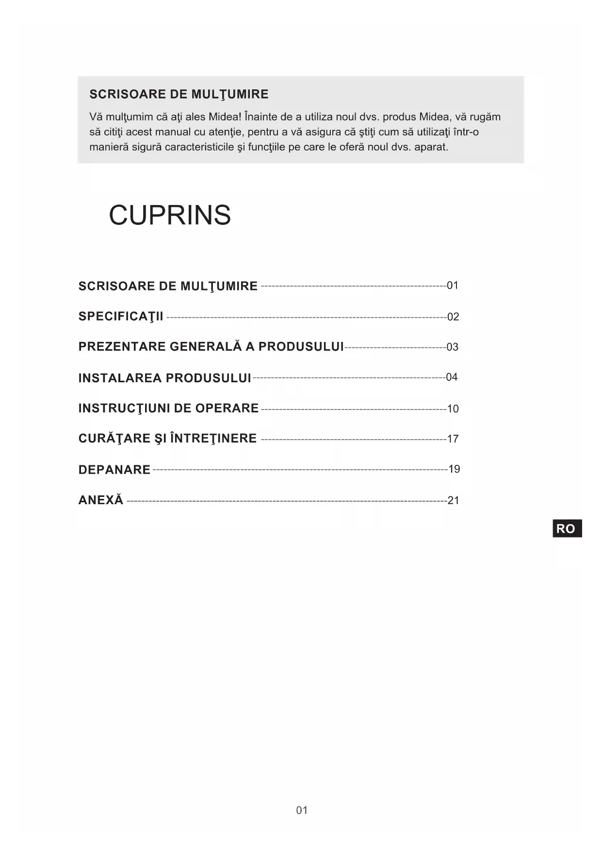 Vă mulţumim că aţi ales Midea! Înainte de a utiliza noul dvs. produs Midea, vă rugăm să citiţi acest manual cu atenţie, pentru a vă asigura că ştiţi cum să utilizaţi într-o manieră sigură caracteristicile şi funcţiile pe care le oferă noul dvs. aparat. CUPRINS
