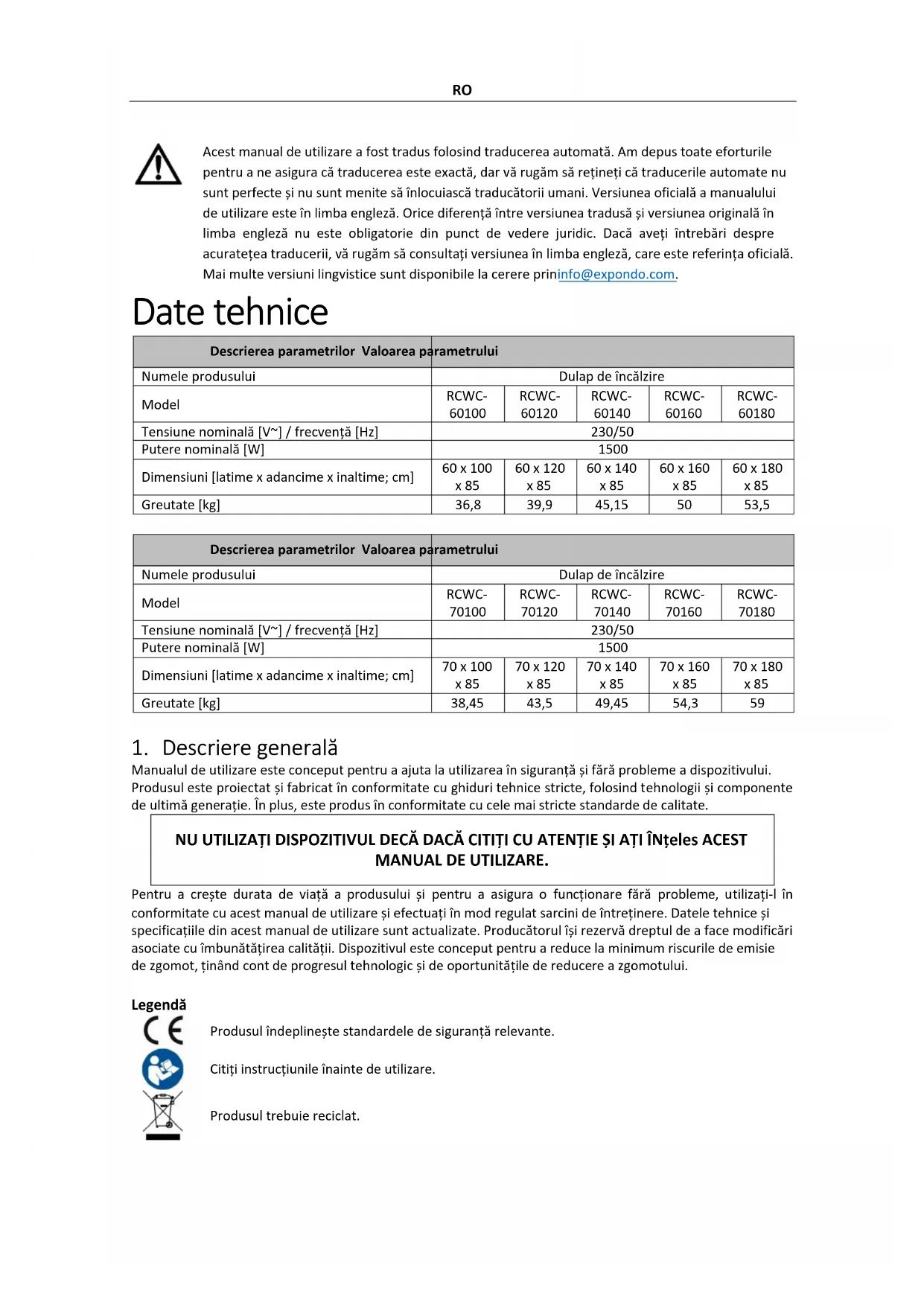 eventualele daune. j) Utilizați o cârpă moale și umedă pentru curățare.RO k) Nu folosiți obiecte ascuțite și/sau metalice pentru curățare (de exemplu, o perie de sârmă sau o spatulă metalică), deoarece acestea pot deteriora materialul de suprafață al aparatului. l) Nu curățați dispozitivul cu o substanță acidă, agenți de uz medical, diluanți, combustibil, uleiuri sau alte substanțe chimice deoarece poate deteriora dispozitivul. ELIMINAREA DISPOZITIVELOR UTILIZATE: Nu aruncați acest dispozitiv în sistemele de deșeuri municipale. Predați-l la un punct de reciclare și colectare a dispozitivelor electrice și electrice. Verificați simbolul de pe produs, manual de instrucțiuni și ambalaj. Materialele plastice utilizate la construirea dispozitivului pot fi reciclate în conformitate cu marcajele lor. Alegând să reciclați, aduceți o contribuție semnificativă la protecția mediului nostru. Contactați autoritățile locale pentru informații despre unitatea locală de reciclare.SL Ta uporabniški priročnik je bil preveden s strojnim prevajanjem. Potrudili smo se, da bi zagotovili točnost prevoda, vendar upoštevajte, da avtomatizirani prevodi niso popolni in niso namenjeni nadomestitvi človeških prevajalcev. Uradna različica uporabniškega priročnika je v angleščini. Morebitne razlike med prevedeno različico in izvirno angleščino niso pravno zavezujoče. Če imate kakršna koli vprašanja o točnosti prevoda, si oglejte angleško različico, ki je uradna referenca. Več jezikovnih različic je na voljo na zahtevo preko info@expondo.com. Tehnični podatki Opis parametra Vrednost parametra Ime izdelka Ogrevalna omara Model RCWC-