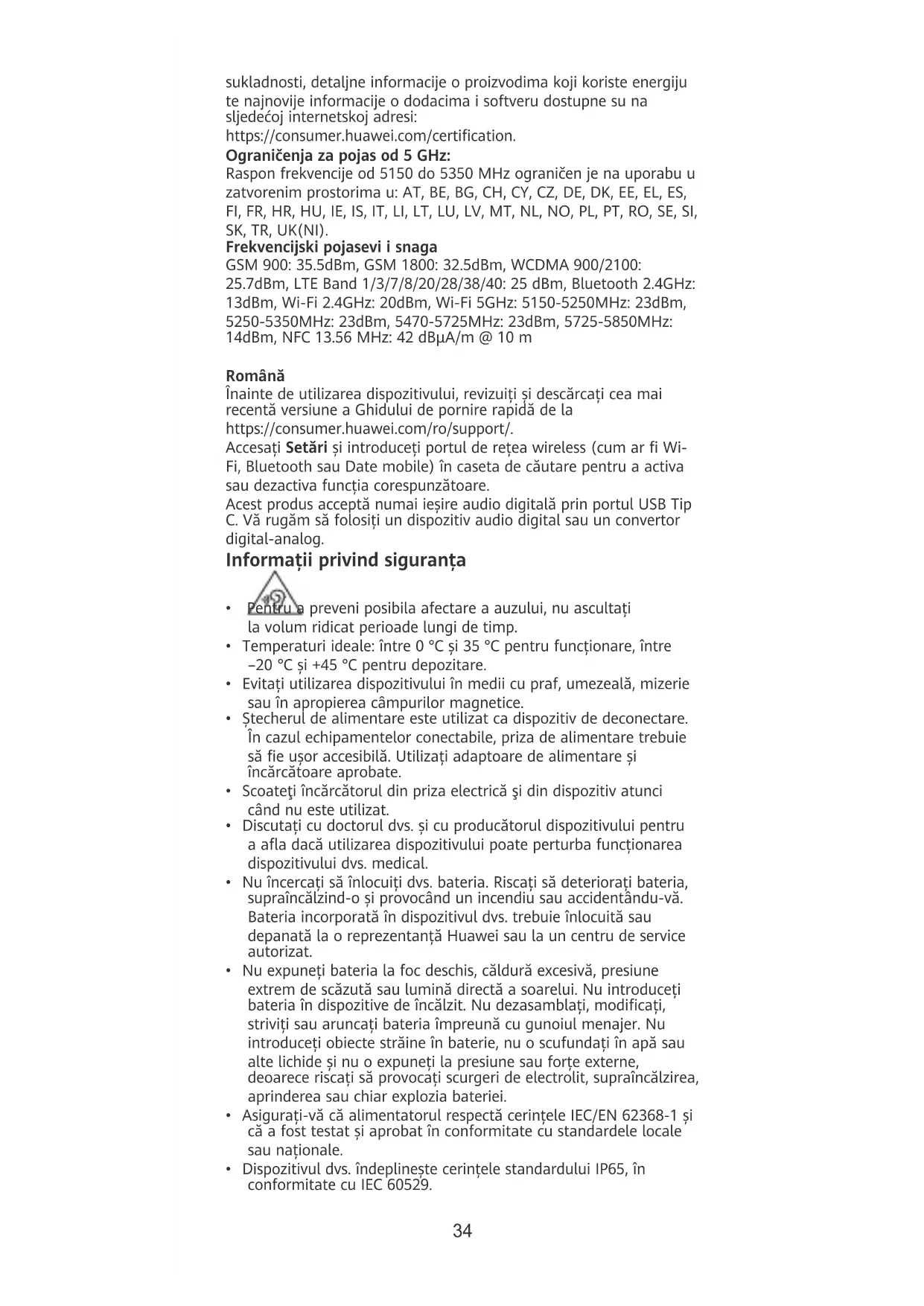 - Acest dispozitiv acceptă încărcare rapidă USB PD. Puterea livrată de încărcător trebuie să e între minimum 5 W (pentru echipamente radio) și maximum 100 W pentru a se obține viteza de încărcare maximă. Informații referitoare la eliminare și reciclare Acest simbol de pe produs, baterie, documentație sau ambalaj înseamnă că, la sfârșitul duratei de viață, produsele și bateriile trebuie predate la punctele de colectare separată a deșeurilor indicate de autoritățile locale. Acest lucru va asigura reciclarea și tratarea deșeurilor EEE într-un mod prin care să se recupereze materiale valoroase și să se protejeze sănătatea umană și mediul înconjurător. Pentru mai multe informații, contactați autoritățile locale, distribuitorul sau serviciul de eliminare a deșeurilor menajere sau să vizitați site-ul web https://consumer.huawei.com/en/. Informații privind expunerea la radiofrecvență Pentru țările care adoptă limita SAR de 2,0 W/kg pentru mai mult de 10 grame de țesut. Dispozitivul respectă specicațiile RF atunci când este ținut lângă ureche sau la o distanță de 0,50 cm de corp. Cea mai mare valoare SAR raportată: SAR la nivelul capului: 0,92 W/kg; SAR la nivelul corpului: 1,28 W/kg. Conformitatea cu reglementările UE Prin prezenta, Huawei Device Co., Ltd. declară că acest dispozitiv MIS-LX9 este în conformitate cu următoarele Directive: RED 2014/53/UE, RoHS 2011/65/UE, ErP 2009/125/CE. Textul complet al Declarației de conformitate pentru UE, informațiile ErP detaliate și cele mai recente informații despre accesorii și software sunt disponibile la următoarea adresă internet: https://consumer.huawei.com/certication