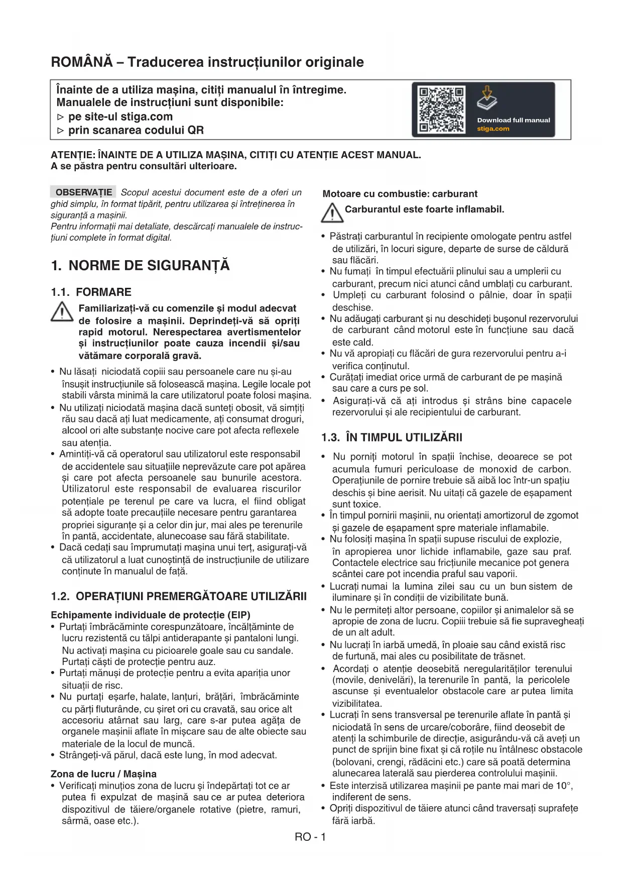 cional. A bateria está carregada. Fusível 5A queimado. Substituir o fusível 5A. NOTA Se os problemas persistirem após a aplicação das soluções descritas, contactar o seu Revendedor. NOTA Para outros problemas não listados na tabela, con- tactar imediatamente um Centro de Assistência Autorizado.RO - 1 Înainte de a utiliza mașina, citiţi manualul în întregime. Manualele de instrucţiuni sunt disponibile: ▷ pe site-ul stiga.com ▷ prin scanarea codului QR Download full manual stiga.com ROMÂNĂ – Traducerea instrucţiunilor originale ATENŢIE: ÎNAINTE DE A UTILIZA MAȘINA, CITIŢI CU ATENŢIE ACEST MANUAL. A se păstra pentru consultări ulterioare. OBSERVAŢIE Scopul acestui document este de a oferi un ghid simplu, în format tipărit, pentru utilizarea și întreținerea în siguranță a mașinii. Pentru informații mai detaliate, descărcați manualele de instruc- țiuni complete în format digital.