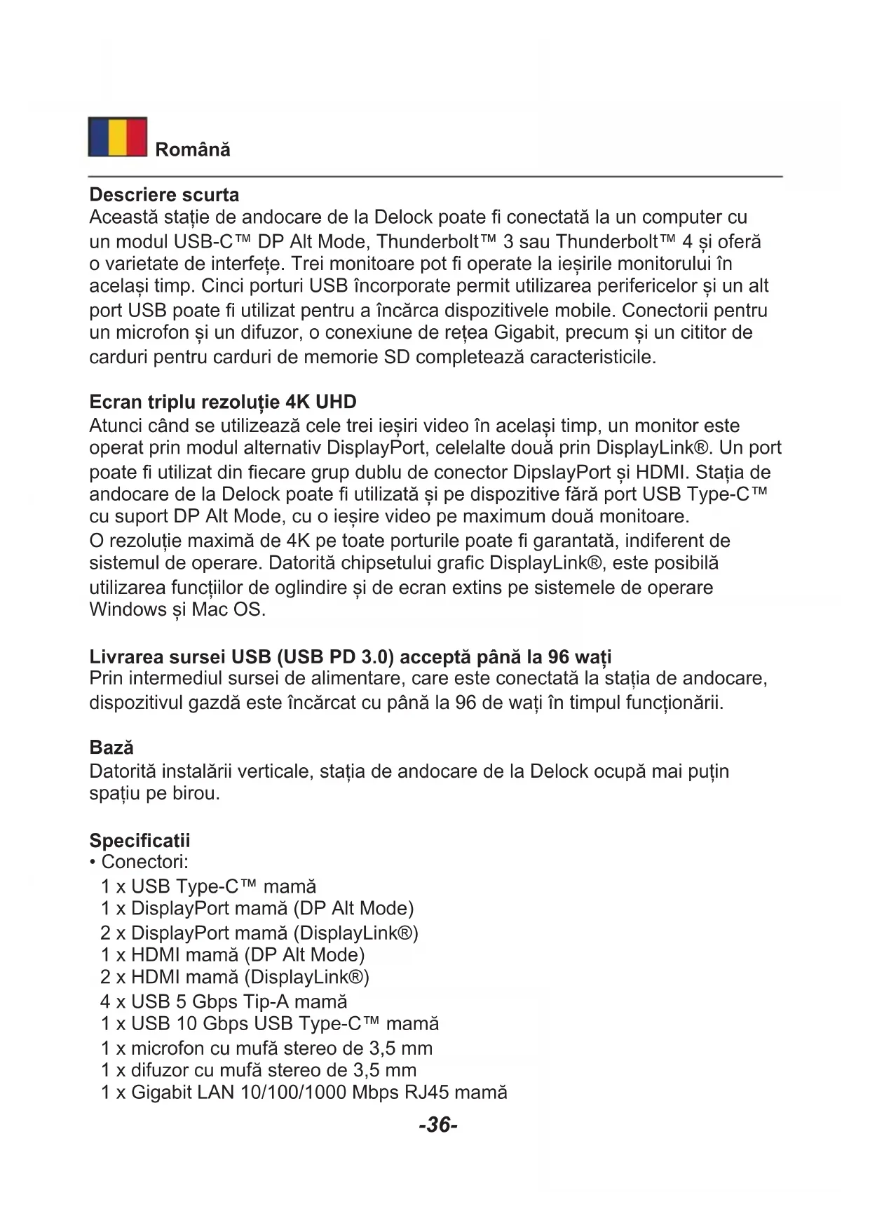Support Delock Om du har ytterligare frågor, kontakt vår kundtjänst på support@delock.de Du hittar aktuell produktinformation på vår hemsida: www.delock.com Slutparagraf Information och data som nns i denna manual kan ändras utan vidare meddelande. Fel och tryckfel undantagna. Upphovsrätt Ingen del av denna manual får reproduceras eller sändas för något syfte oavsett på vilket sätt eller i vilket syfte, elektroniskt eller mekaniskt utan uttryckligt skriftligt godkännande av Delock. Utgåva: 07/2023-36- Română Descriere scurta Această stație de andocare de la Delock poate conectată la un computer cu un modul USB-C™ DP Alt Mode, Thunderbolt™ 3 sau Thunderbolt™ 4 și oferă o varietate de interfețe. Trei monitoare pot operate la ieșirile monitorului în același timp. Cinci porturi USB încorporate permit utilizarea perifericelor și un alt port USB poate utilizat pentru a încărca dispozitivele mobile. Conectorii pentru un microfon și un difuzor, o conexiune de rețea Gigabit, precum și un cititor de carduri pentru carduri de memorie SD completează caracteristicile. Ecran triplu rezoluție 4K UHD Atunci când se utilizează cele trei ieșiri video în același timp, un monitor este operat prin modul alternativ DisplayPort, celelalte două prin DisplayLink®. Un port poate utilizat din ecare grup dublu de conector DipslayPort și HDMI. Stația de andocare de la Delock poate utilizată și pe dispozitive fără port USB Type-C™ cu suport DP Alt Mode, cu o ieșire video pe maximum două monitoare. O rezoluție maximă de 4K pe toate porturile poate garantată, indiferent de sistemul de operare. Datorită chipsetului grac DisplayLink®, este posibilă utilizarea funcțiilor de oglindire și de ecran extins pe sistemele de operare Windows și Mac OS. Livrarea sursei USB (USB PD 3.0) acceptă până la 96 wați Prin intermediul sursei de alimentare, care este conectată la stația de andocare, dispozitivul gazdă este încărcat cu până la 96 de wați în timpul funcționării. Bază Datorită instalării verticale, stația de andocare de la Delock ocupă mai puțin spațiu pe birou. Specicatii