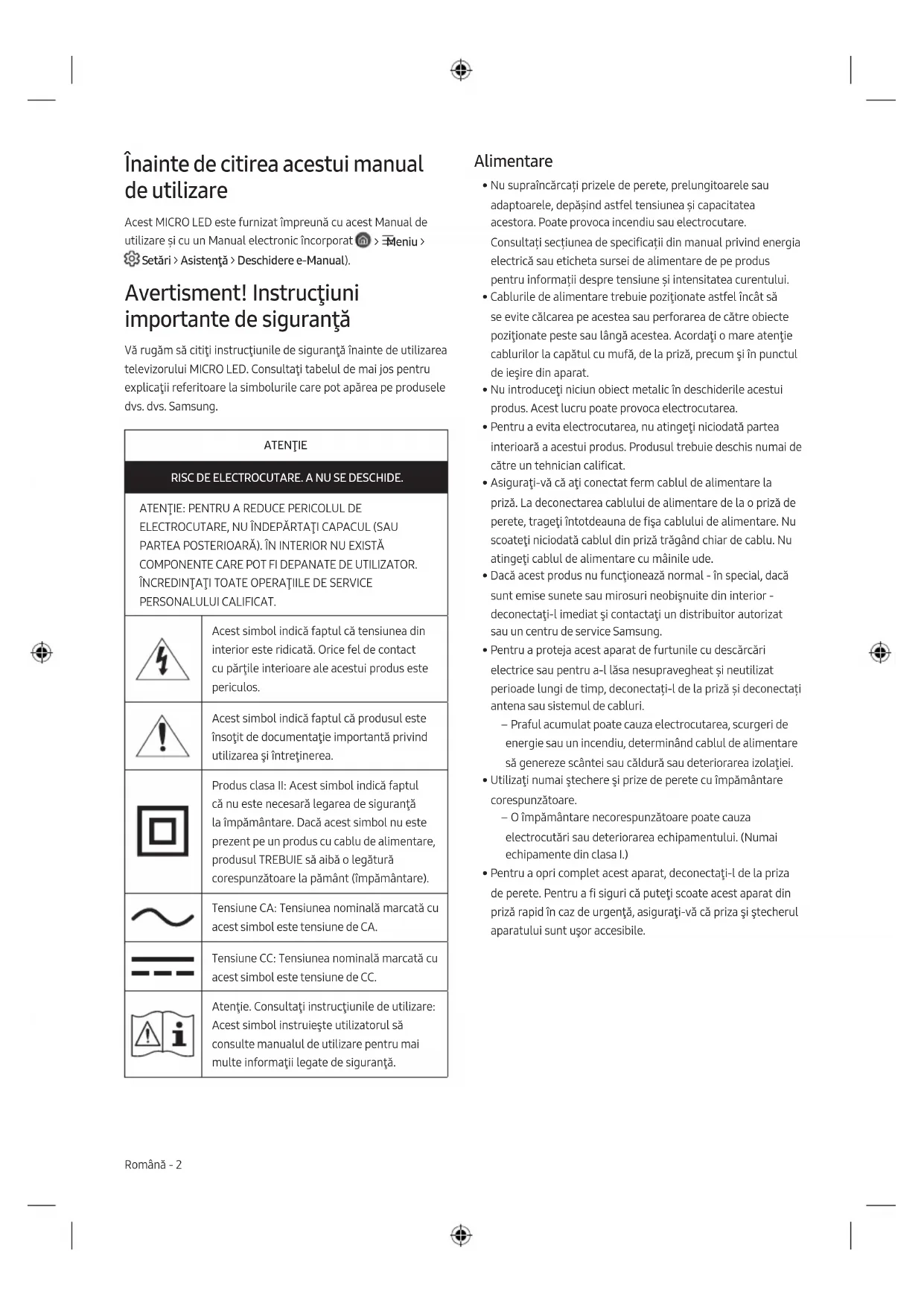 Înainte de citirea acestui manual de utilizare Acest MICRO LED este furnizat împreună cu acest Manual de utilizare și cu un Manual electronic încorporat ( > Meniu > Setări > Asistenţă > Deschidere e-Manual). Avertisment! Instrucţiuni importante de siguranţă Vă rugăm să citiţi instrucţiunile de siguranţă înainte de utilizarea televizorului MICRO LED. Consultaţi tabelul de mai jos pentru explicaţii referitoare la simbolurile care pot apărea pe produsele dvs. dvs. Samsung. ATENŢIE RISC DE ELECTROCUTARE. A NU SE DESCHIDE. ATENŢIE: PENTRU A REDUCE PERICOLUL DE ELECTROCUTARE, NU ÎNDEPĂRTAŢI CAPACUL (SAU