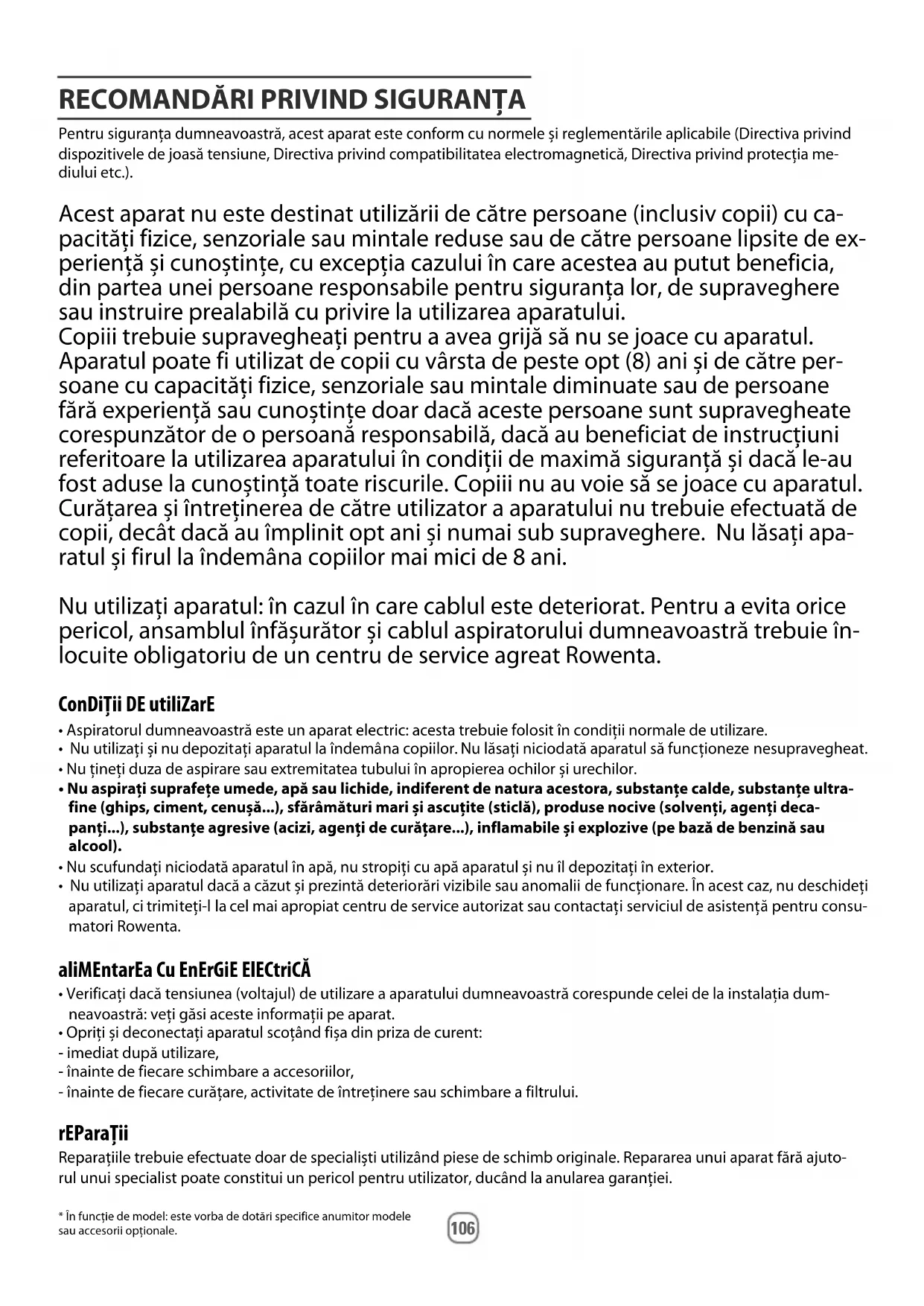 Pentru siguranța dumneavoastră, acest aparat este conform cu normele și reglementările aplicabile (Directiva privind dispozitivele de joasă tensiune, Directiva privind compatibilitatea electromagnetică, Directiva privind protecția me- diului etc.). Acest aparat nu este destinat utilizării de către persoane (inclusiv copii) cu ca- pacități fizice, senzoriale sau mintale reduse sau de către persoane lipsite de ex- periență și cunoștințe, cu excepția cazului în care acestea au putut beneficia, din partea unei persoane responsabile pentru siguranța lor, de supraveghere sau instruire prealabilă cu privire la utilizarea aparatului. Copiii trebuie supravegheați pentru a avea grijă să nu se joace cu aparatul. Aparatul poate fi utilizat de copii cu vârsta de peste opt (8) ani și de către per- soane cu capacități fizice, senzoriale sau mintale diminuate sau de persoane fără experiență sau cunoștințe doar dacă aceste persoane sunt supravegheate corespunzător de o persoană responsabilă, dacă au beneficiat de instrucțiuni referitoare la utilizarea aparatului în condiții de maximă siguranță și dacă le-au fost aduse la cunoștință toate riscurile. Copiii nu au voie să se joace cu aparatul. Curățarea și întreținerea de către utilizator a aparatului nu trebuie efectuată de copii, decât dacă au împlinit opt ani și numai sub supraveghere. Nu lăsați apa- ratul și firul la îndemâna copiilor mai mici de 8 ani. Nu utilizați aparatul: în cazul în care cablul este deteriorat. Pentru a evita orice pericol, ansamblul înfășurător și cablul aspiratorului dumneavoastră trebuie în- locuite obligatoriu de un centru de service agreat Rowenta. ConDiȚii DE utiliZarE