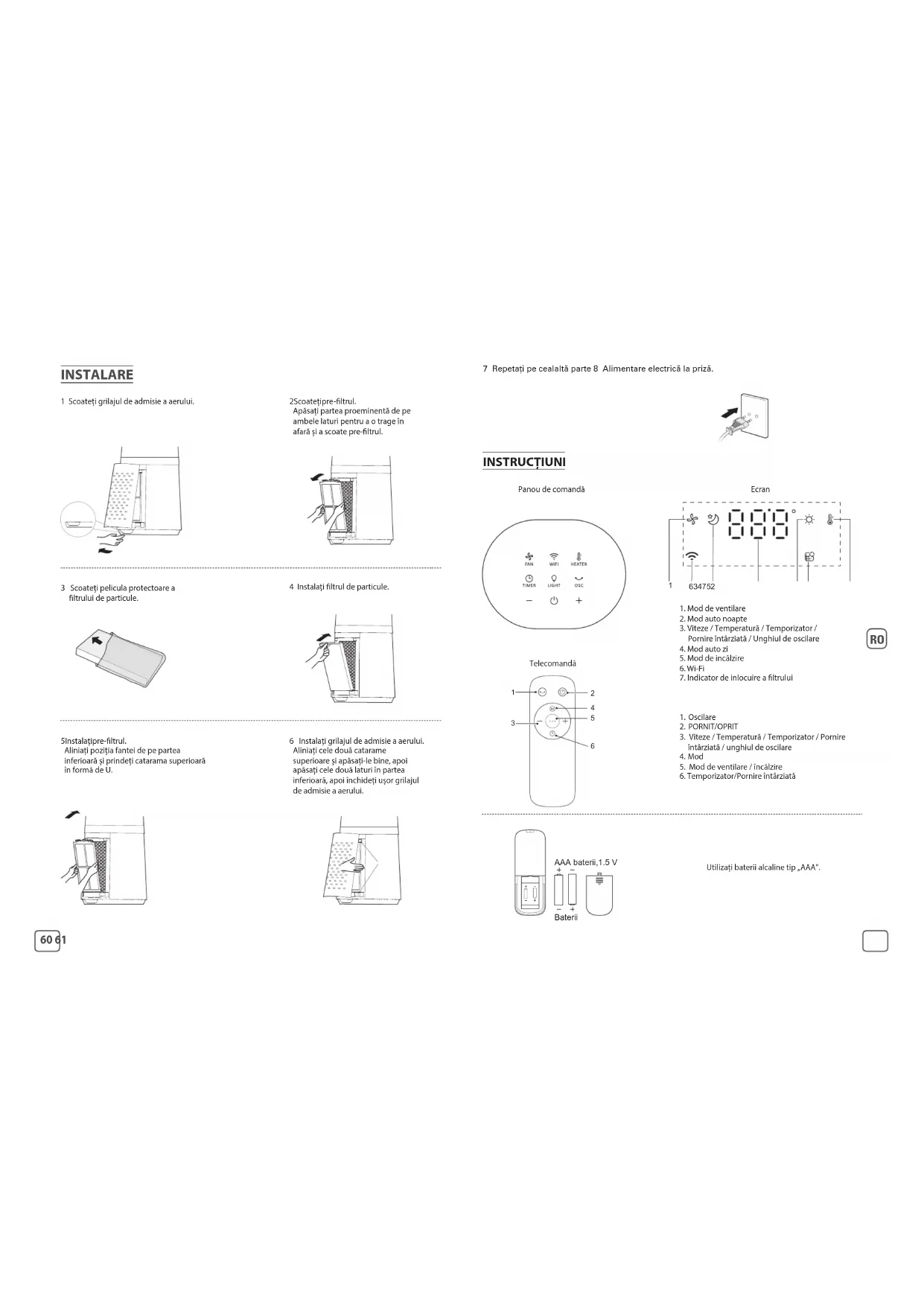 7 Repetați pe cealaltă parte 8 Alimentare electrică la priză. INSTRUCȚIUNI Panou de comandă Telecomandă Ecran