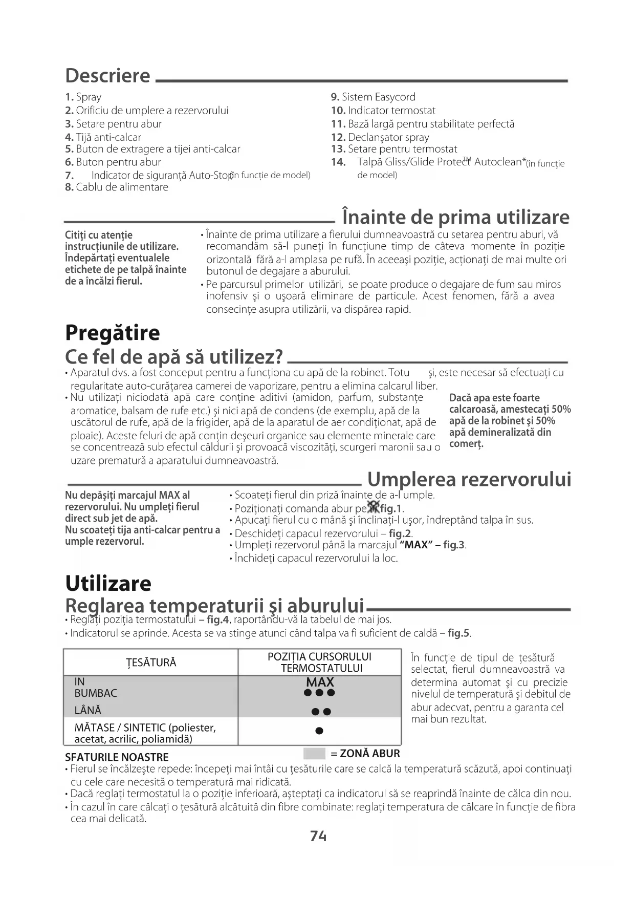 - Reglaţi temperatura în funcţie de materialul călcat.• Setaţi aburul pe – fig.1.• Puteţi călca atunci când indicatorul se stinge. Funcţii suplimentare Talpă Gliss/Glide Protect
