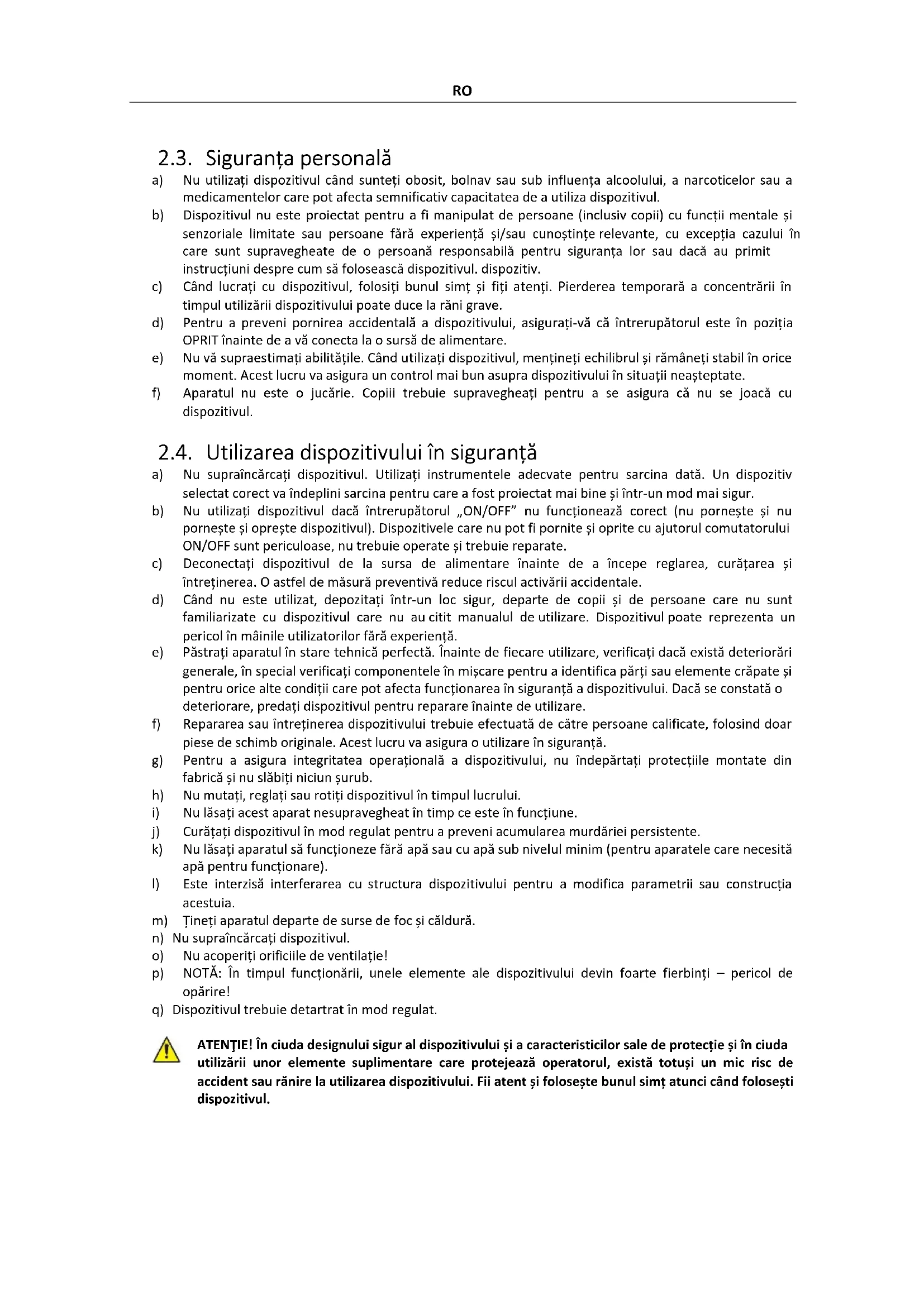 ATENŢIE! În ciuda designului sigur al dispozitivului și a caracteristicilor sale de protecție și în ciuda utilizării unor elemente suplimentare care protejează operatorul, există totuși un mic risc de accident sau rănire la utilizarea dispozitivului. Fii atent și folosește bunul simț atunci când folosești dispozitivul.RO