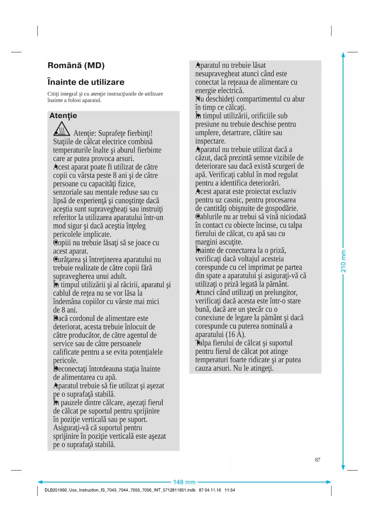 DLB251960_Use_Instruction_IS_7043_7044_7055_7056_INT_5712811851.indb 86 04.11.16 11:54Română (MD) Înainte de utilizare Citiţi integral şi cu atenţie instrucţiunile de utilizare înainte a folosi aparatul. Atenţie