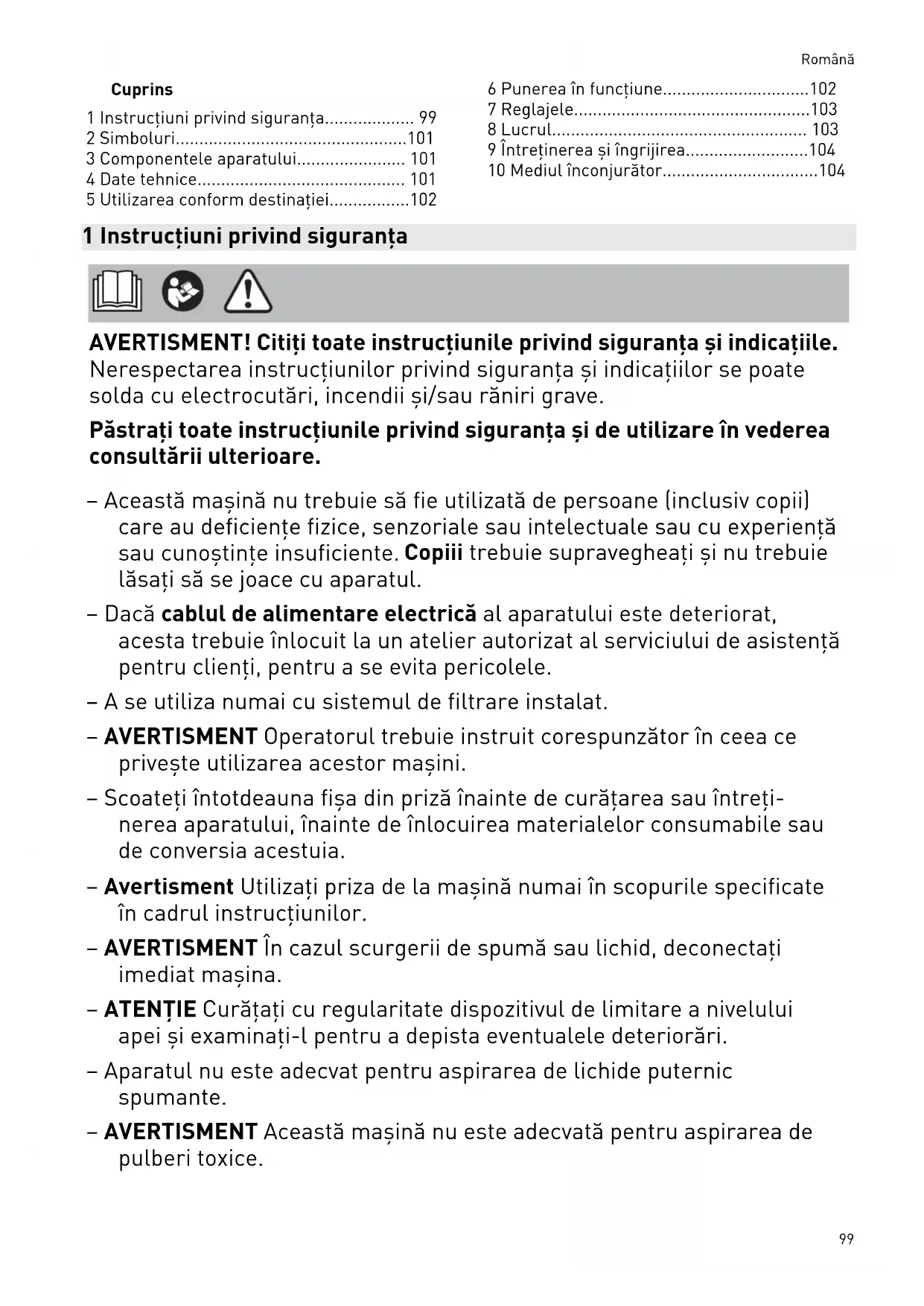- 98Cuprins 1 Instrucţiuni privind siguranţa p. 99