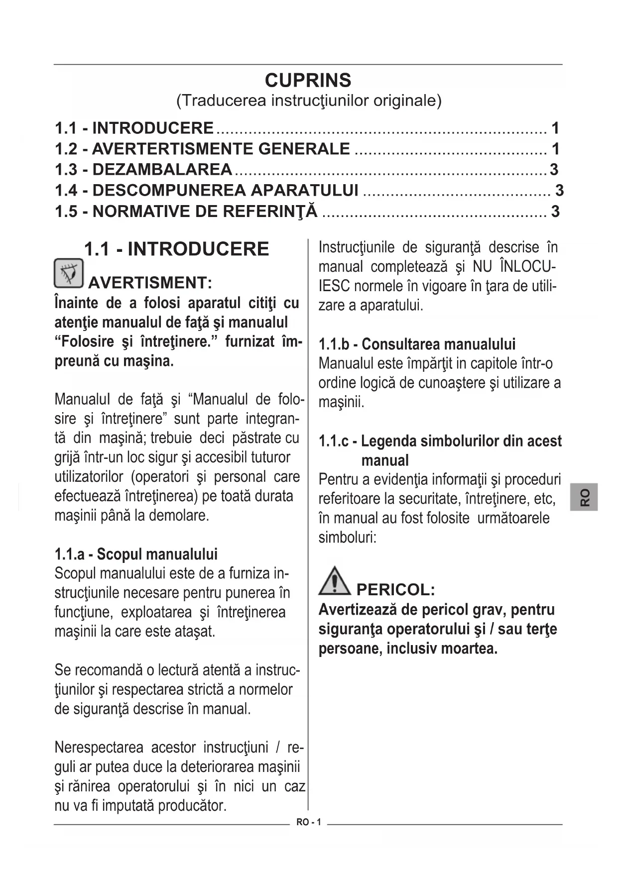 manual Pentru a evidenţia informaţii şi proceduri referitoare la securitate, întreţinere, etc, în manual au fost folosite următoarele simboluri: PERICOL: Avertizează de pericol grav, pentru siguranţa operatorului şi / sau terţe persoane, inclusiv moartea. CUPRINS (Traducerea instrucţiunilor originale)