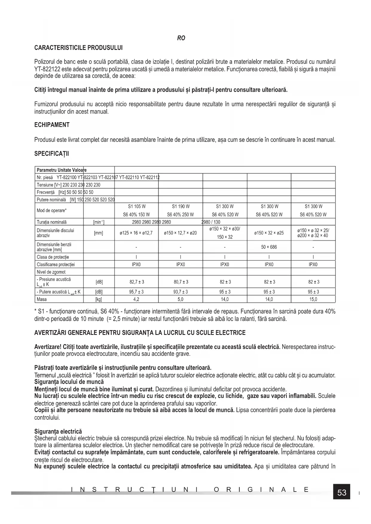 CARACTERISTICILE PRODUSULUI Polizorul de banc este o sculă portabilă, clasa de izolație I, destinat polizării brute a materialelor metalice. Produsul cu numărul YT-822122 este adecvat pentru polizarea uscată și umedă a materialelor metalice. Funcționarea corectă, fi abilă și sigură a mașinii depinde de utilizarea sa corectă, de aceea: Citiți întregul manual înainte de prima utilizare a produsului și păstrați-l pentru consultare ulterioară. Furnizorul produsului nu acceptă nicio responsabilitate pentru daune rezultate în urma nerespectării regulilor de siguranță și instrucțiunilor din acest manual. ECHIPAMENT Produsul este livrat complet dar necesită asamblare înainte de prima utilizare, așa cum se descrie în continuare în acest manual. SPECIFICAȚII Parametru Unitate Valoare Nr. piesă YT-822100 YT-822103 YT-822107 YT-822110 YT-822112 Tensiune [V~] 230 230 230 230 230 Frecvență [Hz] 50 50 50 50 50 Putere nominală [W] 150 250 520 520 520 Mod de operare* S1 105 W S6 40% 150 W S1 190 W S6 40% 250 W S1 300 W S6 40% 520 W S1 300 W S6 40% 520 W S1 300 W S6 40% 520 W Turația nominală [min