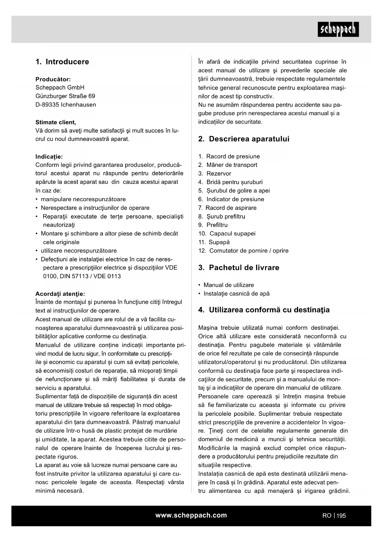 - Defecțiuni ale instalaţiei electrice în caz de neres- pectare a prescripţiilor electrice şi dispoziţiilor VDE 0100, DIN 57113 / VDE 0113 Acordaţi atenţie: Înainte de montajul şi punerea în funcţiune citiţi întregul text al instrucţiunilor de operare. Acest manual de utilizare are rolul de a vă facilita cu- noaşterea aparatului dumneavoastră şi utilizarea posi- bilităţilor aplicative conforme cu destinaţia. Manualul de utilizare conține indicații importante pri- vind modul de lucru sigur, în conformitate cu prescripți- ile și economic cu aparatul și cum să evitați pericolele, să economisiți costuri de reparație, să micșorați timpii de nefuncționare și să măriți abilitatea și durata de serviciu a aparatului. Suplimentar față de dispozițiile de siguranță din acest manual de utilizare trebuie să respectați în mod obliga- toriu prescripțiile în vigoare referitoare la exploatarea aparatului din țara dumneavoastră. Păstraţi manualul de utilizare într-o husă de plastic protejat de murdărie şi umiditate, la aparat. Acestea trebuie citite de perso- nalul de operare înainte de începerea lucrului şi res- pectate riguros. La aparat au voie să lucreze numai persoane care au fost instruite privitor la utilizarea aparatului şi care cu- nosc pericolele legate de aceasta. Respectaţi vârsta minimă necesară.www.scheppach.com