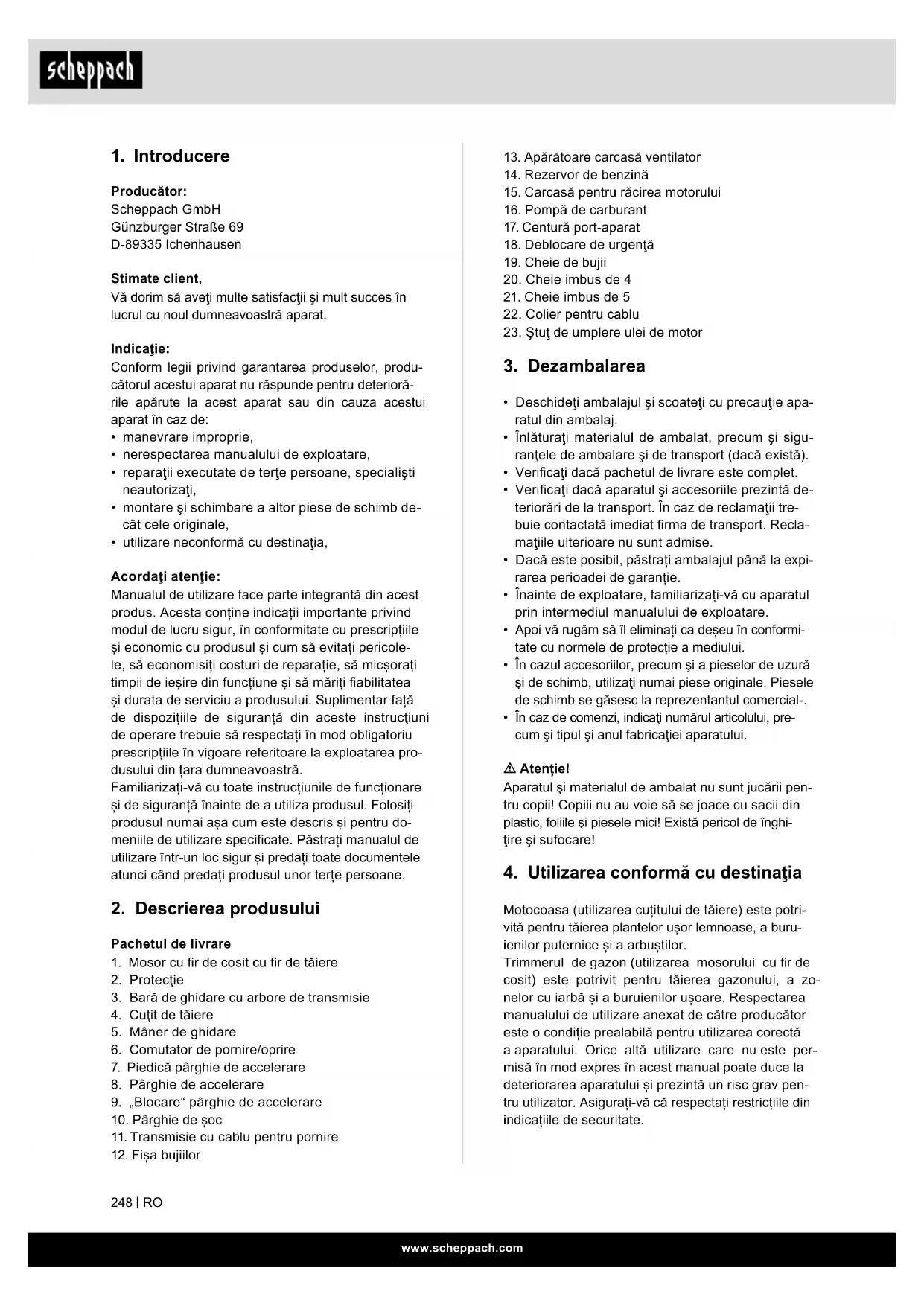Producător: Scheppach GmbH Günzburger Straße 69 D-89335 Ichenhausen Stimate client, Vă dorim să aveţi multe satisfacţii şi mult succes în lucrul cu noul dumneavoastră aparat. Indicaţie: Conform legii privind garantarea produselor, produ- cătorul acestui aparat nu răspunde pentru deterioră- rile apărute la acest aparat sau din cauza acestui aparat în caz de: