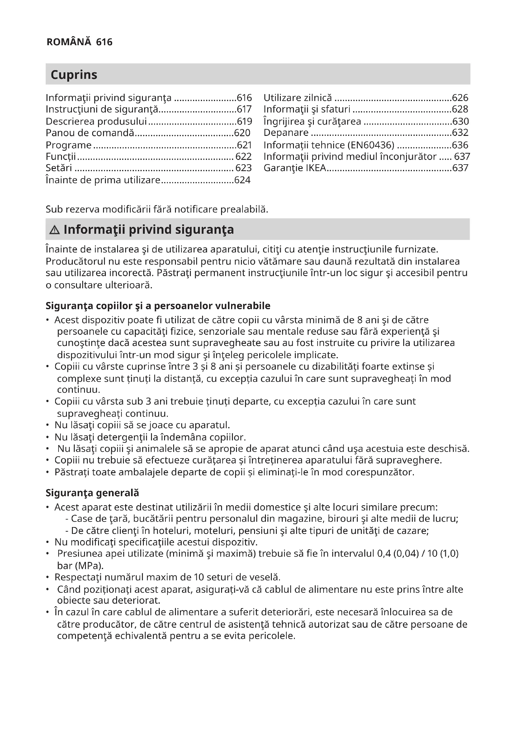 - În cazul în care cablul de alimentare a suferit deteriorări, este necesară înlocuirea sa de către producător, de către centrul de asistenţă tehnică autorizat sau de către persoane de competenţă echivalentă pentru a se evita pericolele. Informaţii privind siguranţa ........................616 Instrucţiuni de siguranţă..............................617 Descrierea produsului ..................................619 Panou de comandă ......................................620 Programe .......................................................621 Funcții ............................................................ 622 Setări .............................................................623 Înainte de prima utilizare ............................624 Utilizare zilnică .............................................626 Informaţii şi sfaturi ......................................628 Îngrijirea şi curăţarea ..................................630 Depanare ......................................................632 Informații tehnice (EN60436) .....................636 Informaţii privind mediul înconjurător ..... 637 Garanţie IKEA ................................................ 637ROMÂNĂ 617