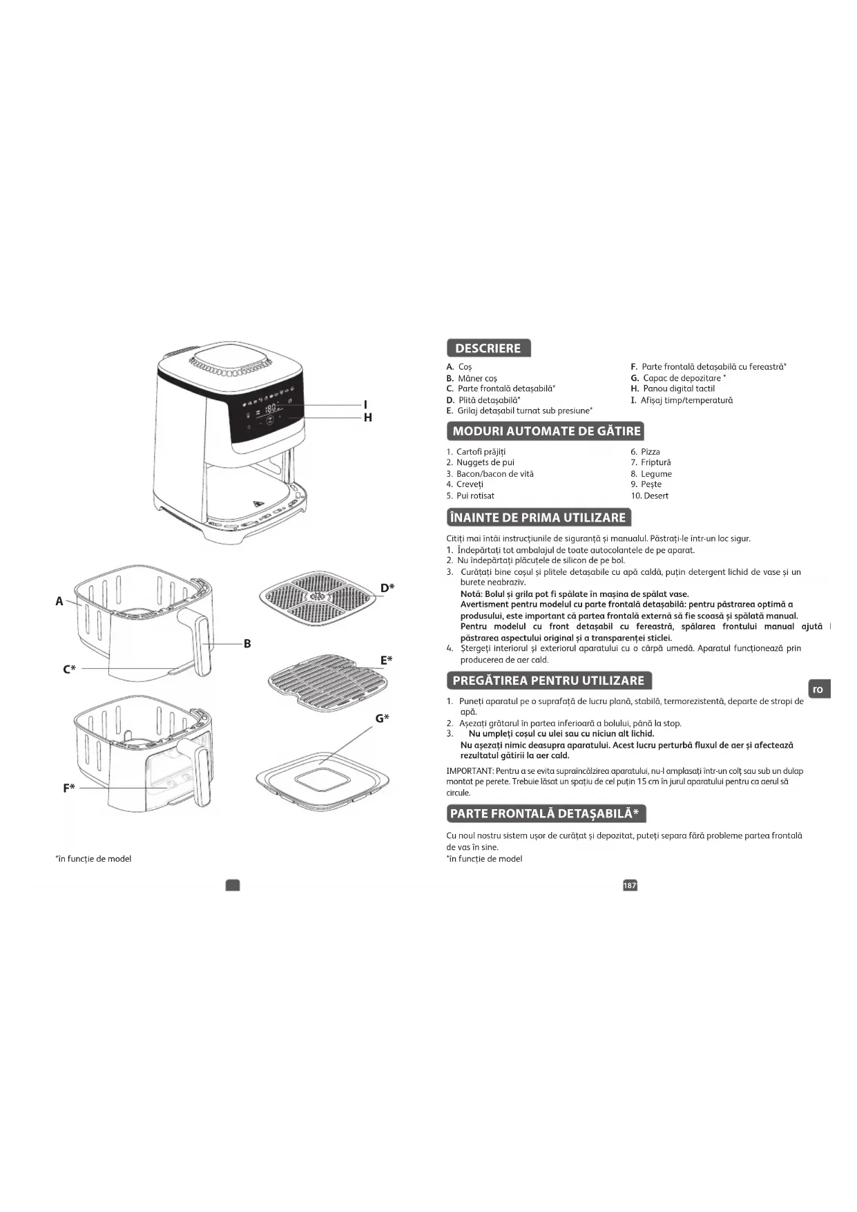 *în funcție de model DESCRIERE A. Coș B. Mâner coș C. Parte frontală detașabilă* D. Plită detașabilă* E. Grilaj detașabil turnat sub presiune* F. Parte frontală detașabilă cu fereastră* G. Capac de depozitare * H. Panou digital tactil